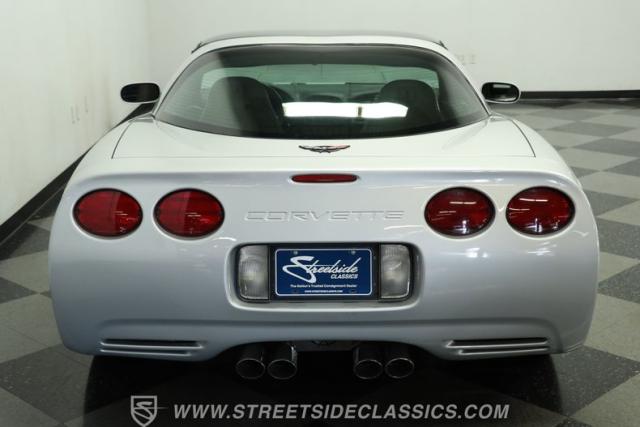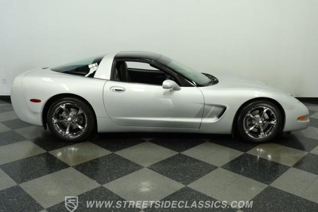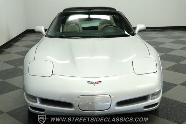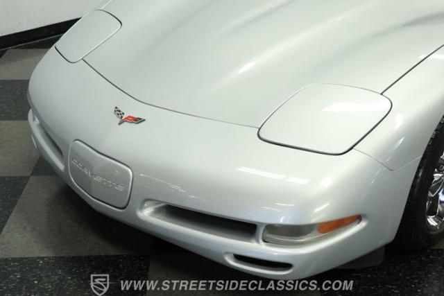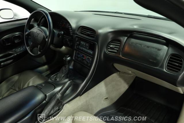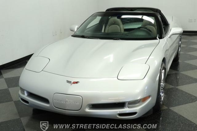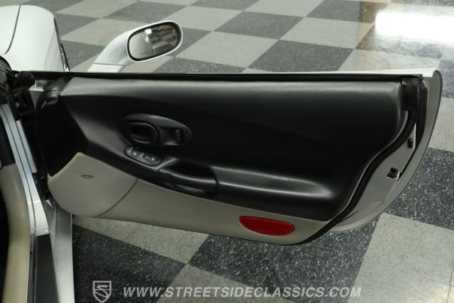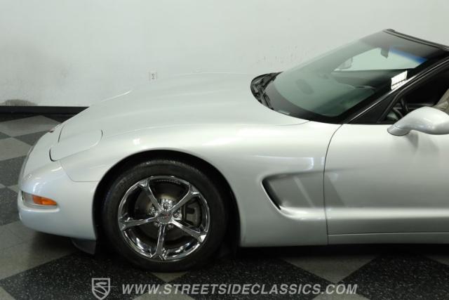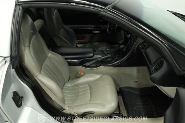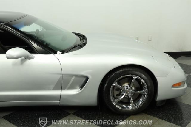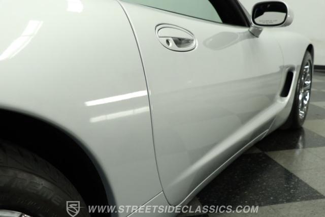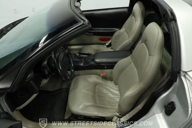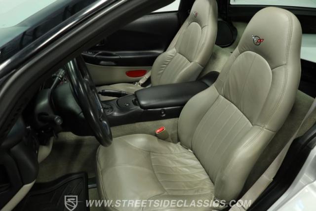 The Sebring Silver Metallic paint of this 79,365-mile, 1998 Chevrolet Corvette shimmers with an understated intensity. Its sculpted lines exude a timeless elegance, free of any distracting stripes. The meticulously maintained finish whispers a story of careful ownership. Upgraded C6 Corvette polished aluminum wheels, staggered at 17-inches in front and 18-inches in the rear, are wrapped in Continental performance tires (245/45ZR17 front, 275/40ZR18 rear), granting this Corvette a confident stance.