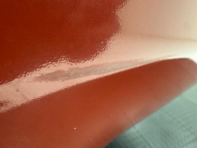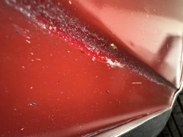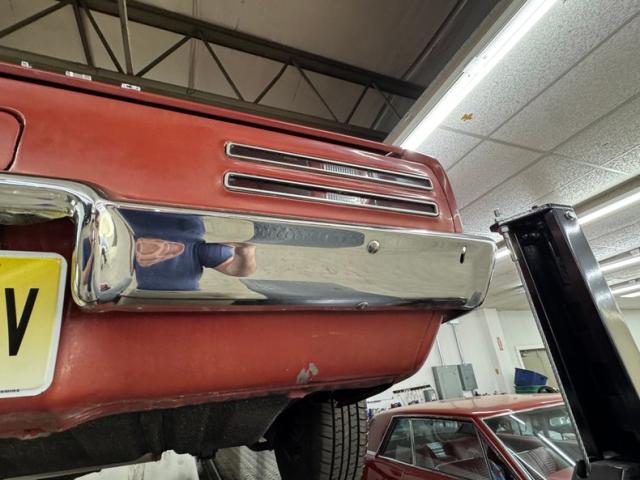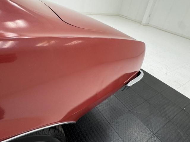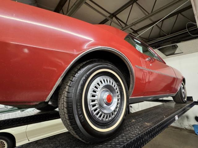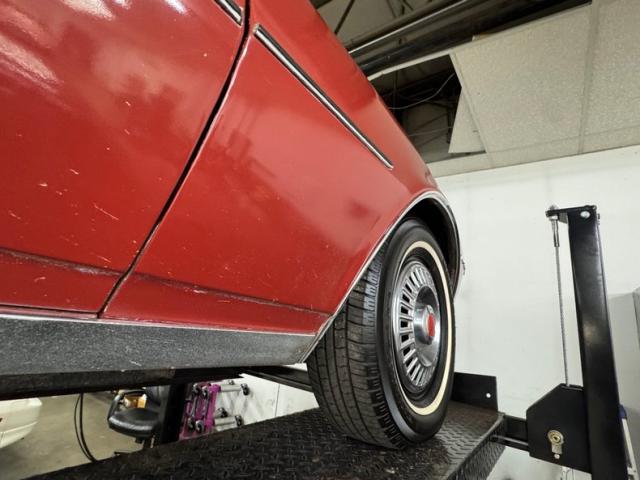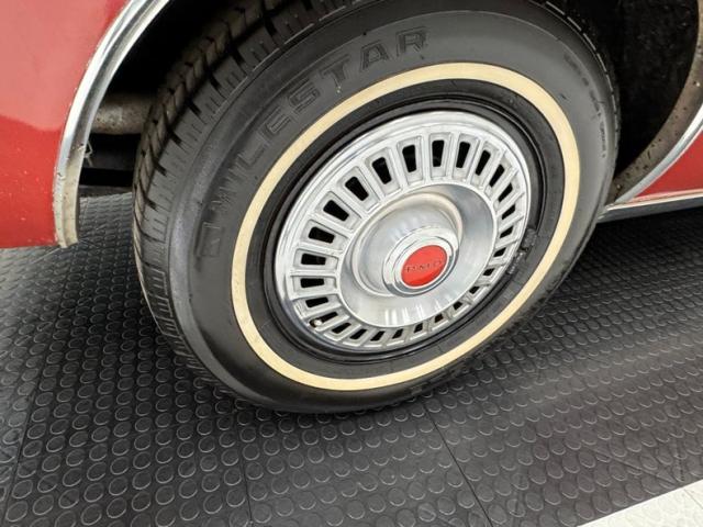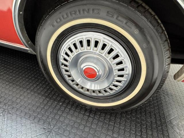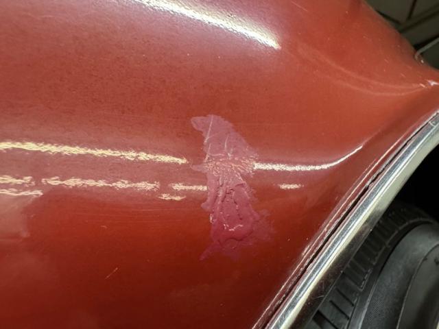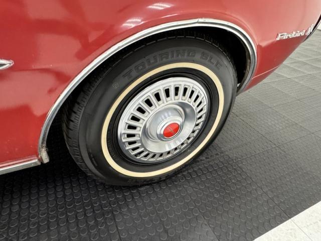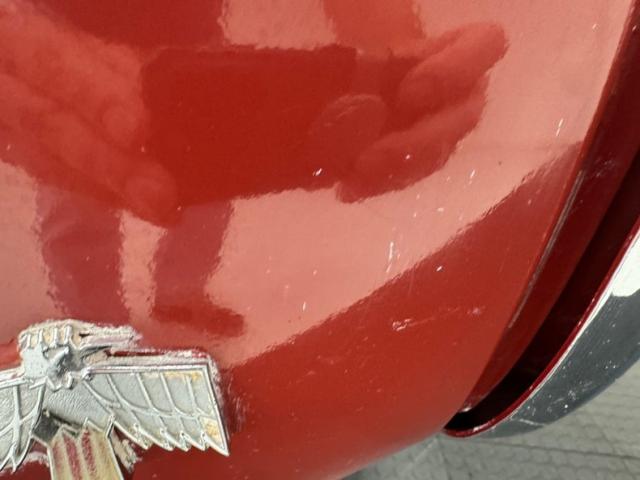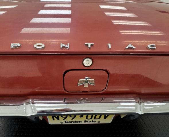 One respray of Regimental Red, retained in single stage application, covers this pony car and reaches all the way back to the rear fascia to surround the slit style tail lights. Up front, this pre Endura nose is all chrome surrounding the dual headlight like spectacles and coming to the characteristic Pontiac beaked point in the center. Long before the screaming chicken would appear, a bird depicted in more Native American motif adorns the car, appearing on both front fenders and the gas tank door in back.14-inch wheels where PMD branded wheel covers, rather pedestrian for a sporty car, and the 215/70R14 white wall tires have an early 2022 date code. Imperfections include paint chips, scuffs, scratches, orange peel, a tops surface stain, curb rash on the wheel covers, surface rust and peeling paint on rear valance, and peeling paint on the lower character line.
