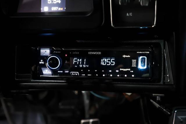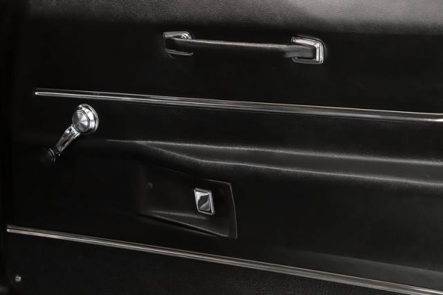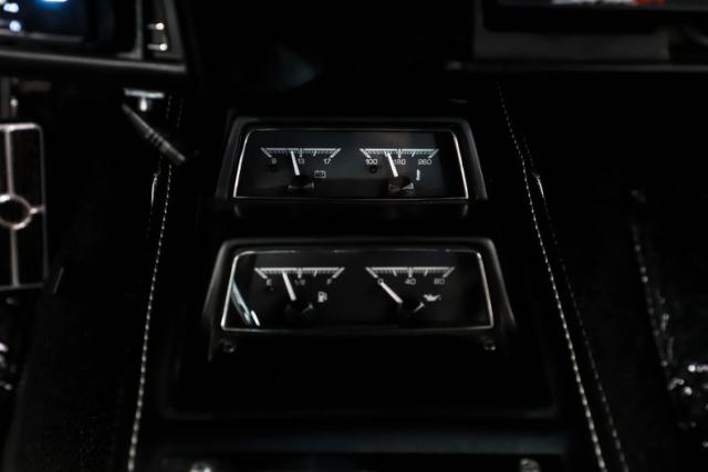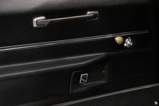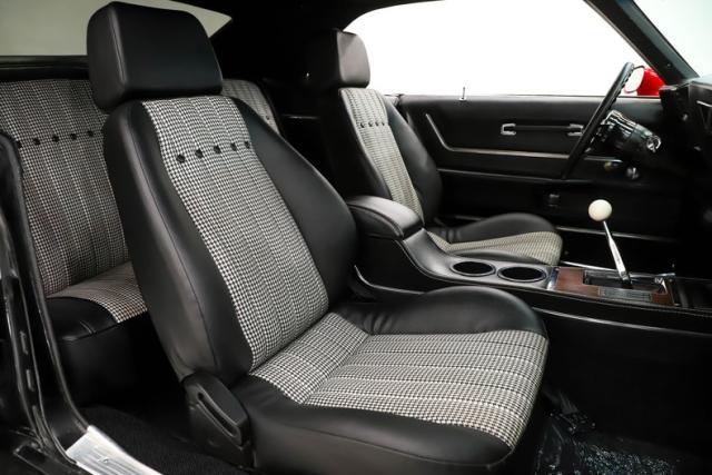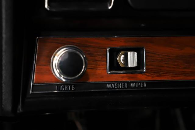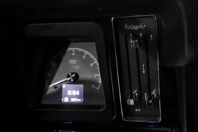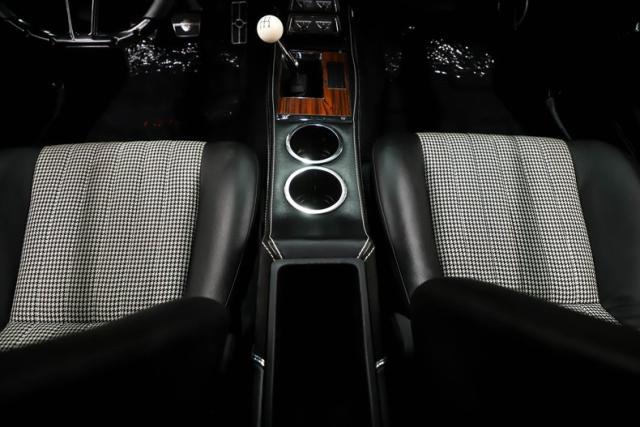 INTERIOR: It has a great blend of nostalgia with modern upgrades. The seats are upholstered in the houndstooth material, the front seats are sport buckets. The custom center console incorporates original style features like the woodgrain shift bezel and the gauge pod, but it is upholstered with a raised armrest and cup holders. All the instrumentation has been upgraded with Dakota Digital. It also has a stereo system with a Kenwood unit, custom kick panel speakers, 6x9s and a subwoofer in the back. The climate controls are updated Vintage Air, they are now electric slides not the old cables. A tilt column has a good-looking Billet Specialties steering wheel. Down on the floor is nice carpet and embroidered mats. Overhead the headliner has been replaced. It has the deluxe molded door panels that look new too.