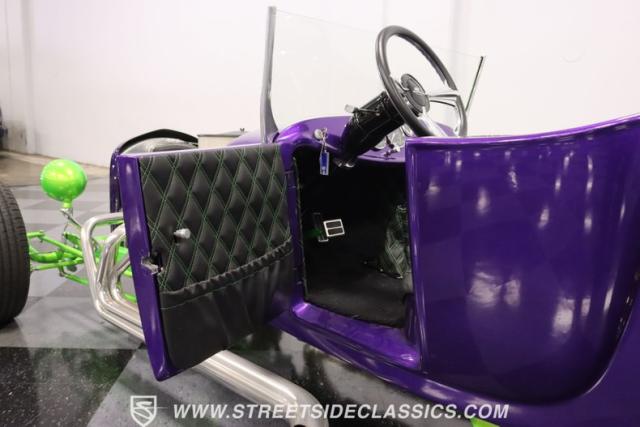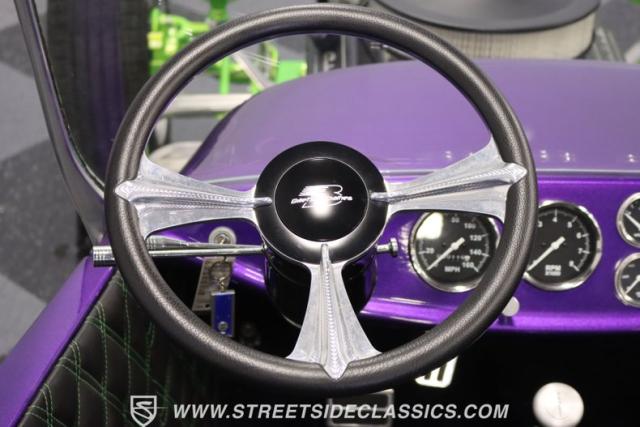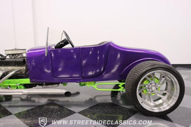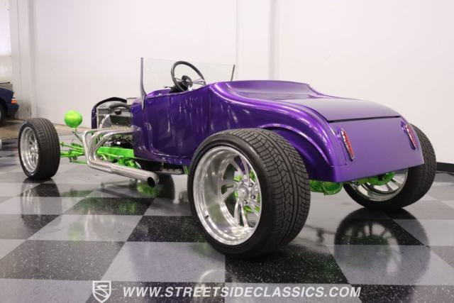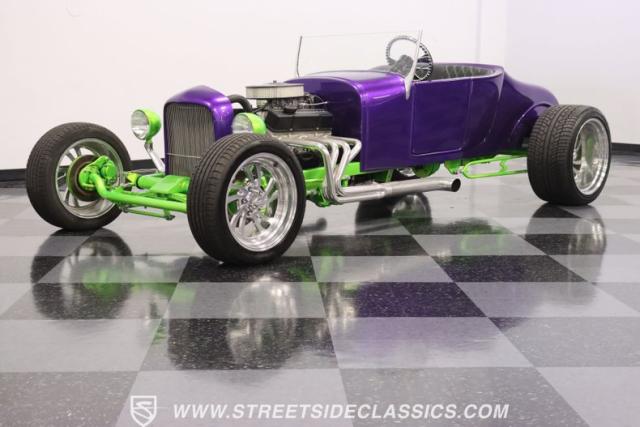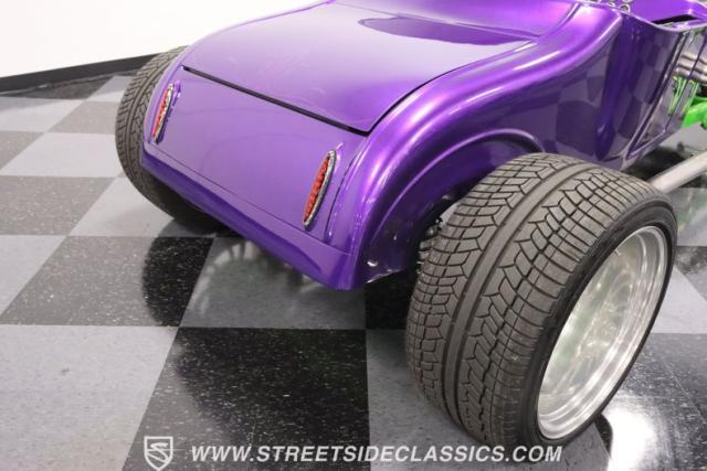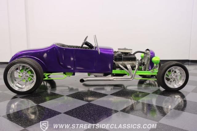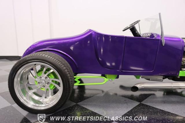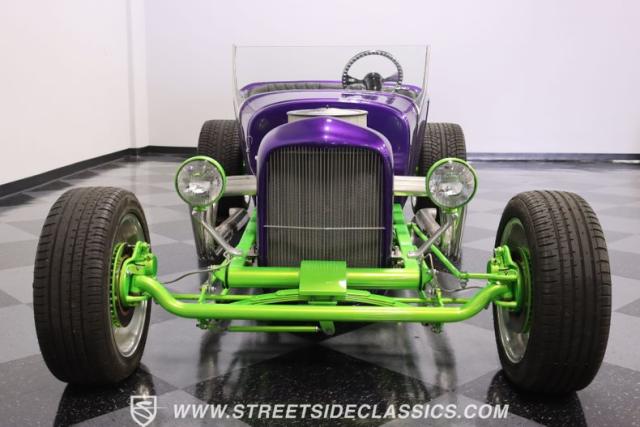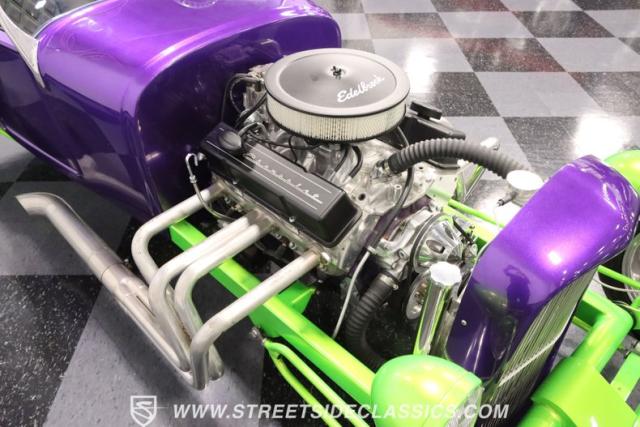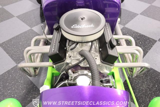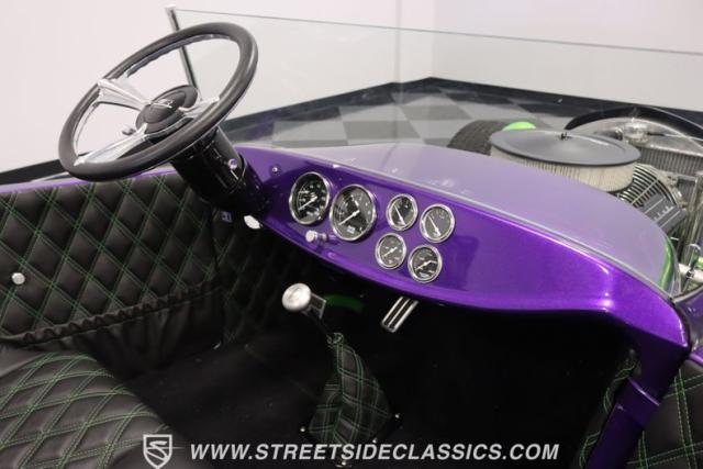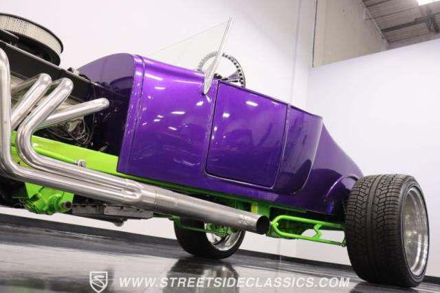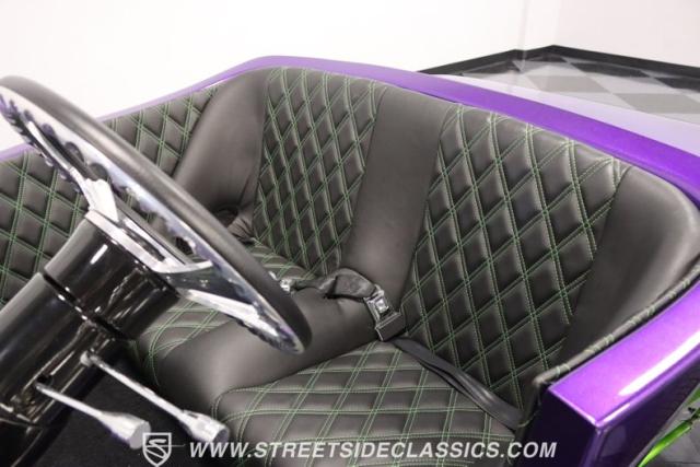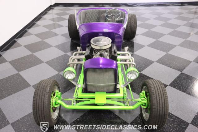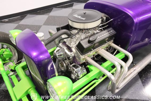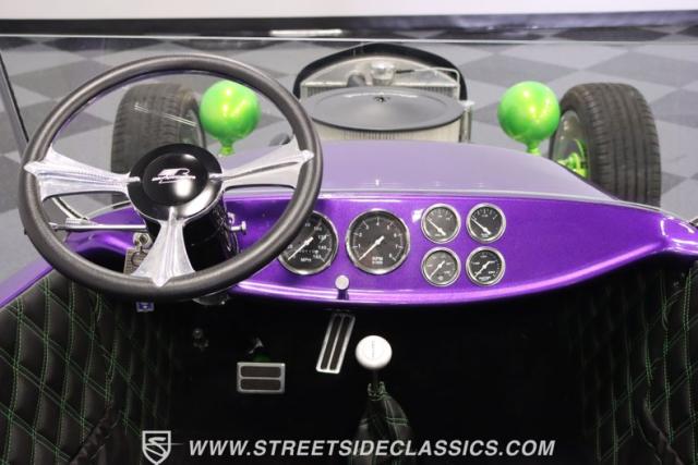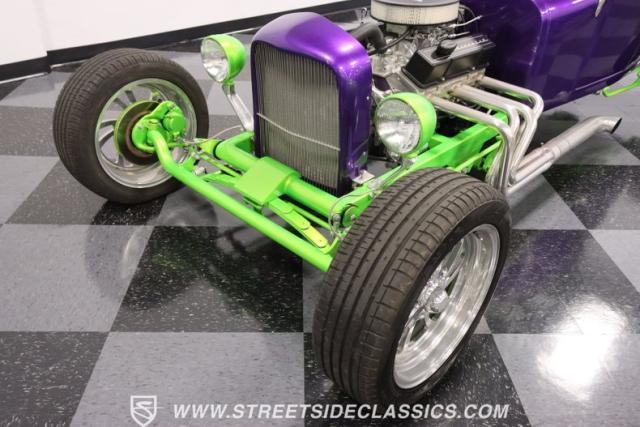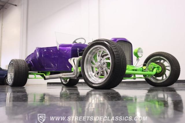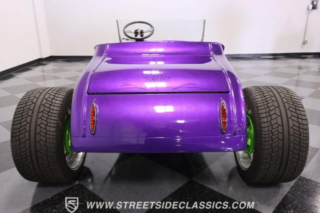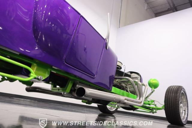 This 1927 Ford Model T Roadster, in a bold purple and lime green paint scheme, is a far cry from the original Model T\'s somber black. The gleaming chrome accents and custom pinstriping scream for attention, while those staggered American Racing wheels 17\" in front, a massive 20\" in the back hint at the unbridled power lurking up front and the low, throaty growl of those side pipes. It\'s the perfect soundtrack for cruising city streets or winding country roads, a rebellious symphony that speaks of a century\'s worth of automotive evolution.