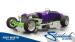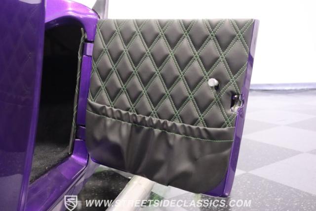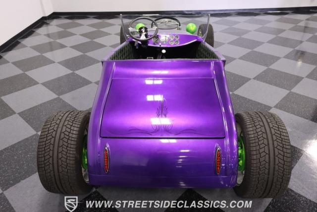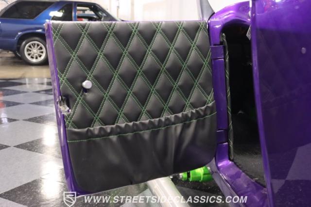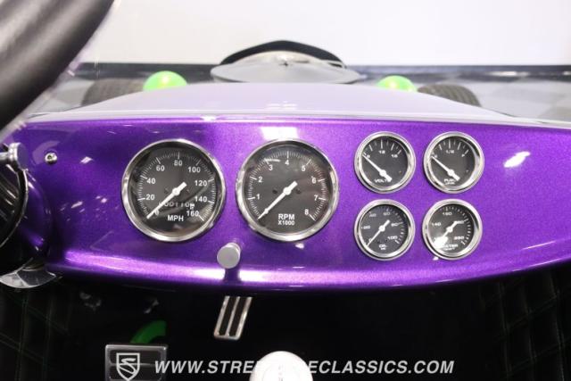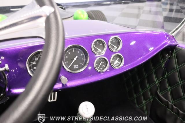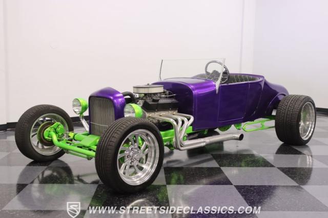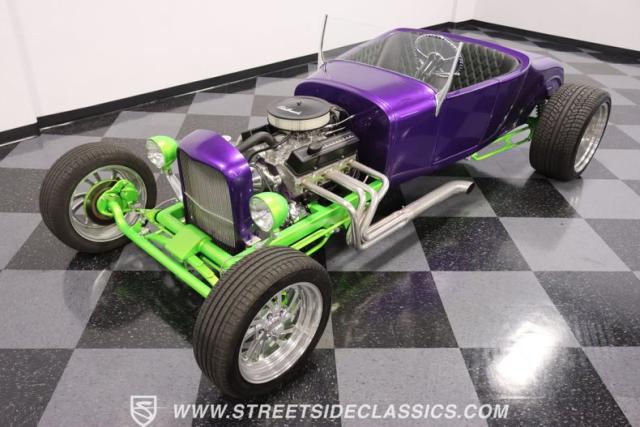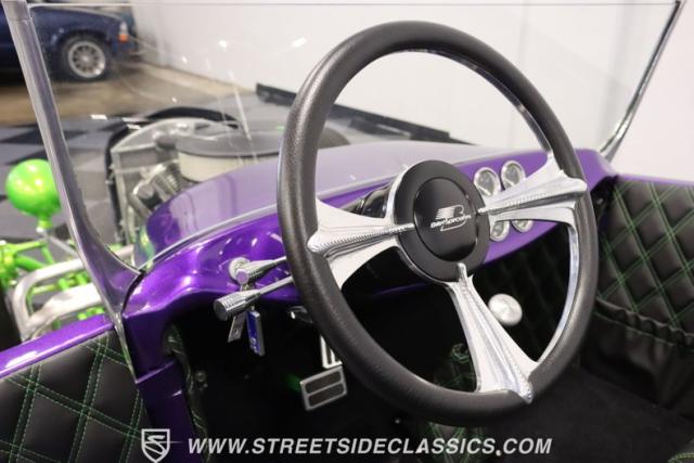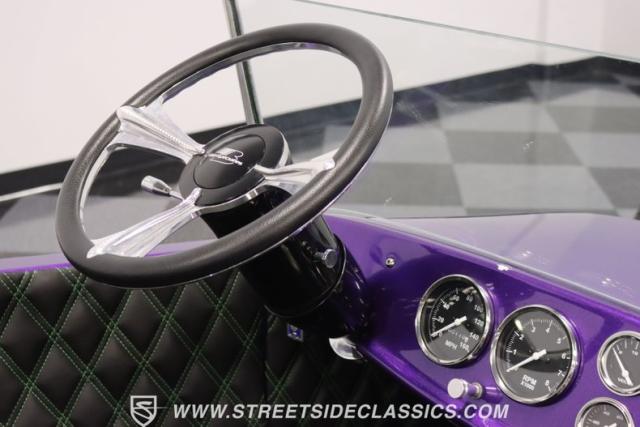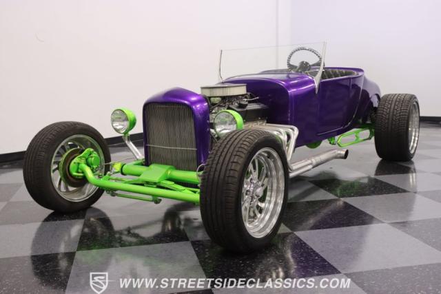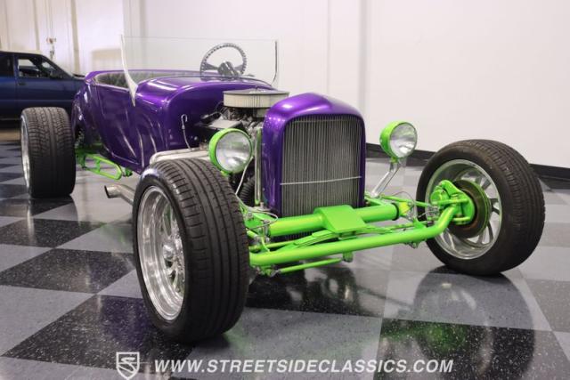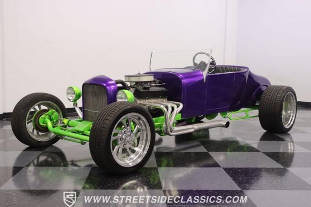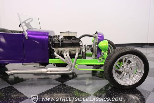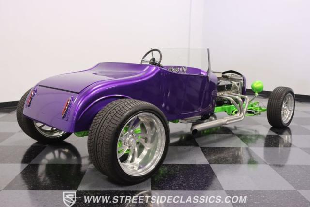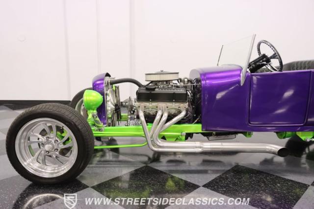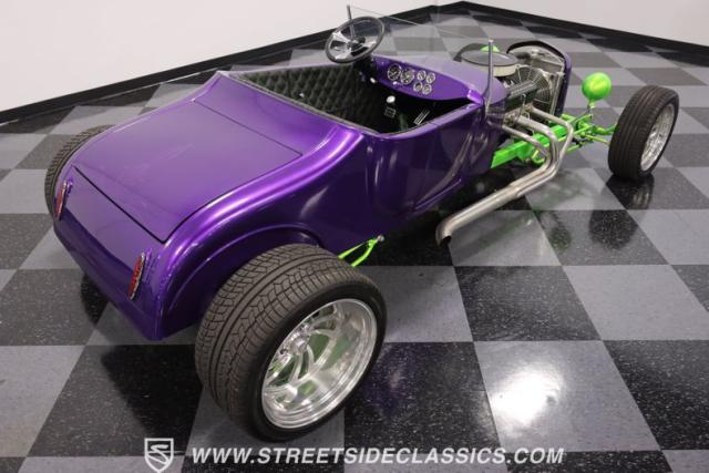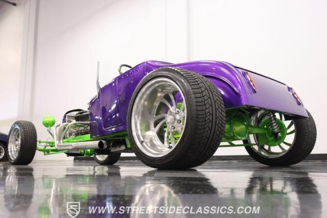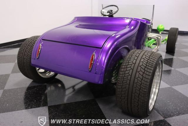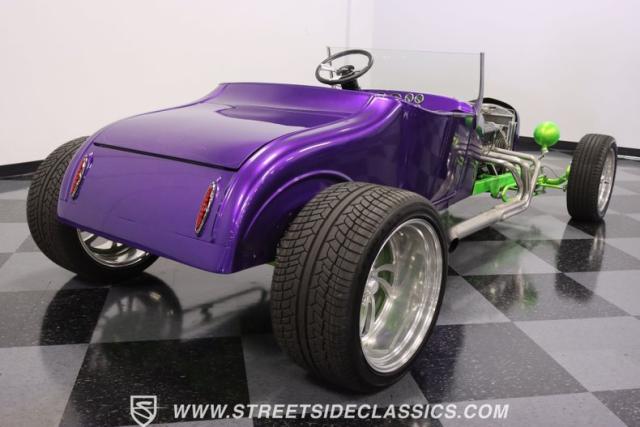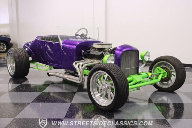 This 1927 Ford Model T Roadster, in a bold purple and lime green paint scheme, is a far cry from the original Model T\'s somber black. The gleaming chrome accents and custom pinstriping scream for attention, while those staggered American Racing wheels 17\" in front, a massive 20\" in the back hint at the unbridled power lurking up front and the low, throaty growl of those side pipes. It\'s the perfect soundtrack for cruising city streets or winding country roads, a rebellious symphony that speaks of a century\'s worth of automotive evolution.