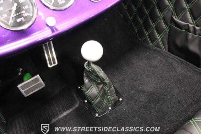 Open the door on either side of this roadster and sink into the plush, black leather seat, where the custom green stitching is a delightful surprise. The Billet Specialties steering wheel adds a cool custom touch and the vintage-inspired gauges hold the promise of modern precision. Rising from the floor, the Lokar shifter stands like a beacon, tempting you to unleash the power that lies beneath. Out back you have the luxury of a finished out trunk which holds the fuel cell and allows for some modest storage.