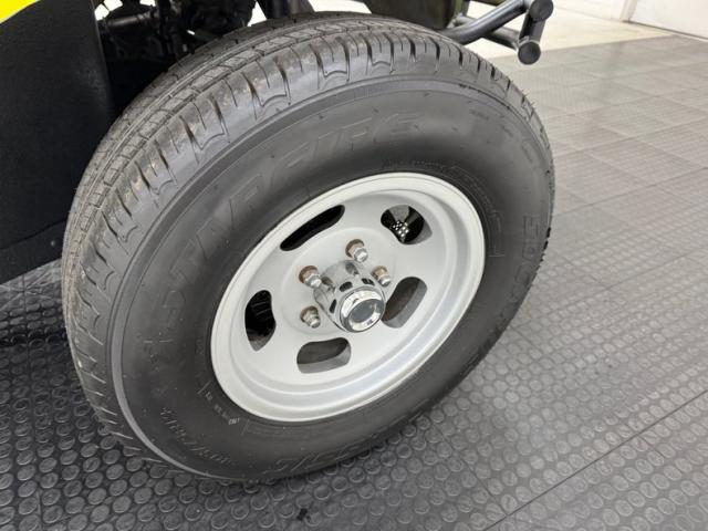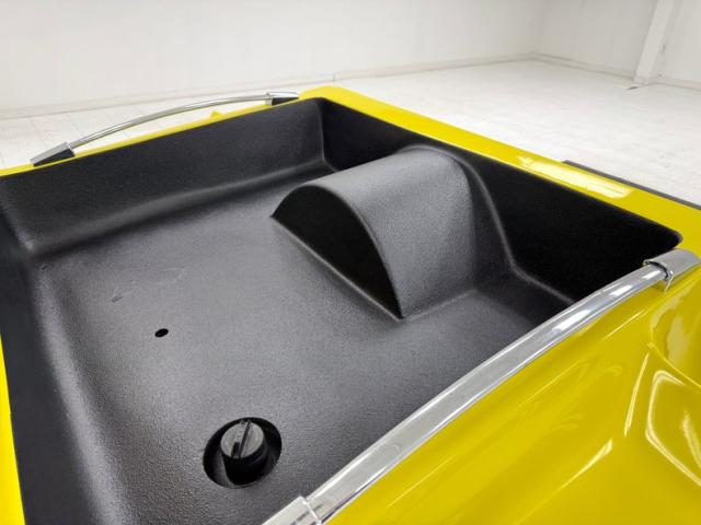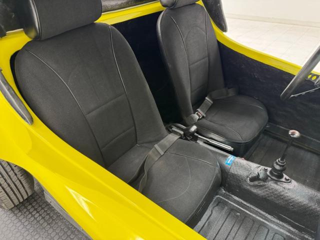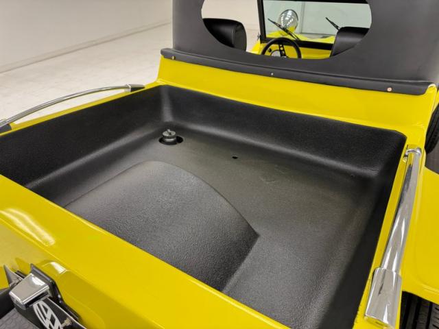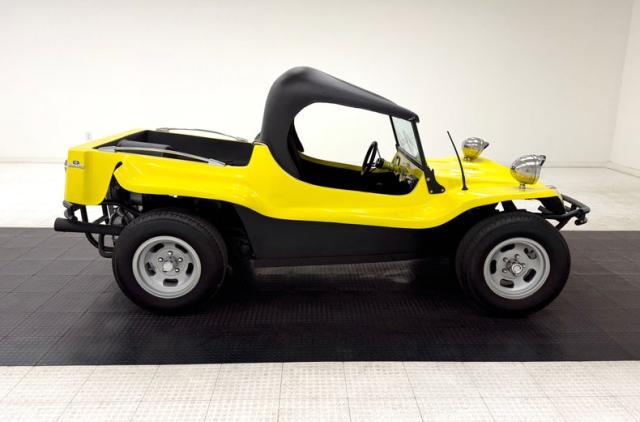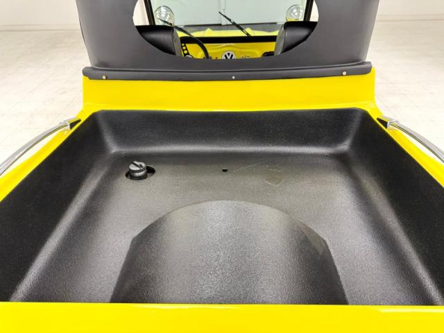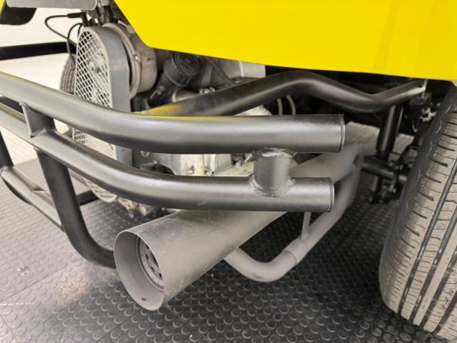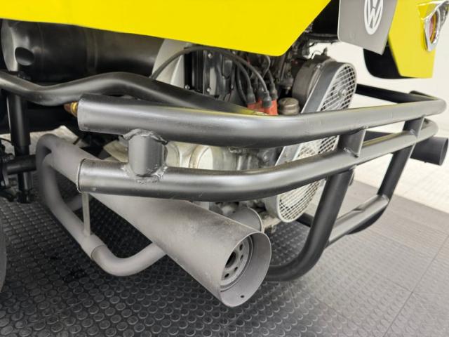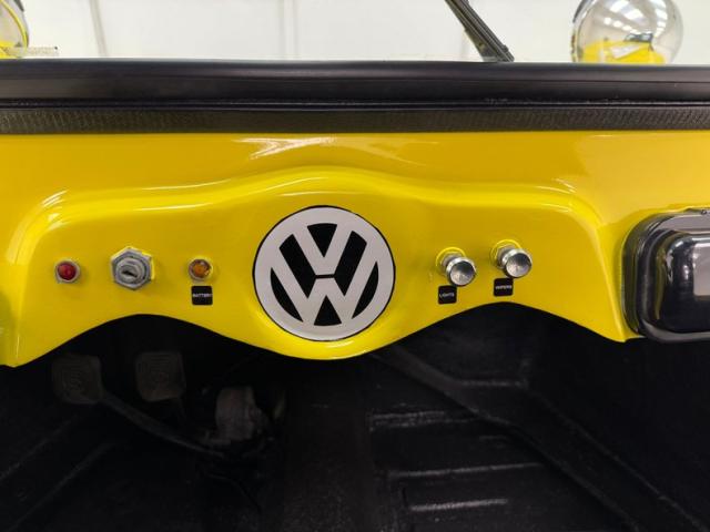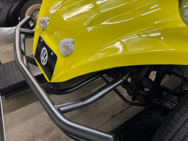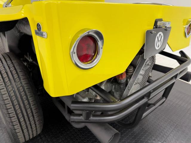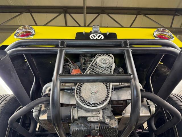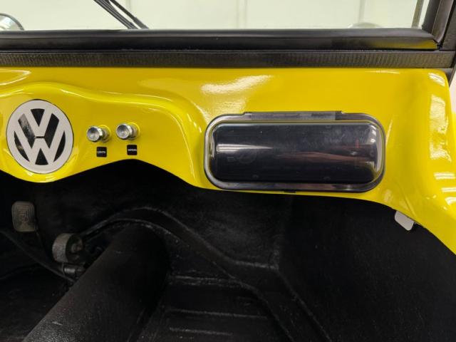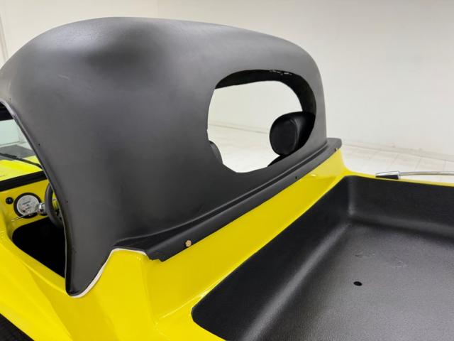 If you\'re going to be out in the sun, you might as well wear its color as this fiberglass body buggy does and there\'s no fancy name for it other than Yellow! It\'s still open wheeled but integrated fenders form a tall canopy over each wheel preventing sand from being kicked in your face. The aluminum slot type wheels are 14-inch and carry 205/75R14 tires and along with the suspension, lift the car off the ground so you can clear egg laying sea turtles, sand castles, sidewinder rattlesnakes and anything else your sand adventures encounter. Cuteness comes from the bugeye headlights with one noted as winking slightly and might need a nut tightened while marker lights are mounted in front and round tail lights in back. The black plastic roof keeps the sun off your skin and of course, can be removed. The exterior is in great shape with no noticeable imperfections.