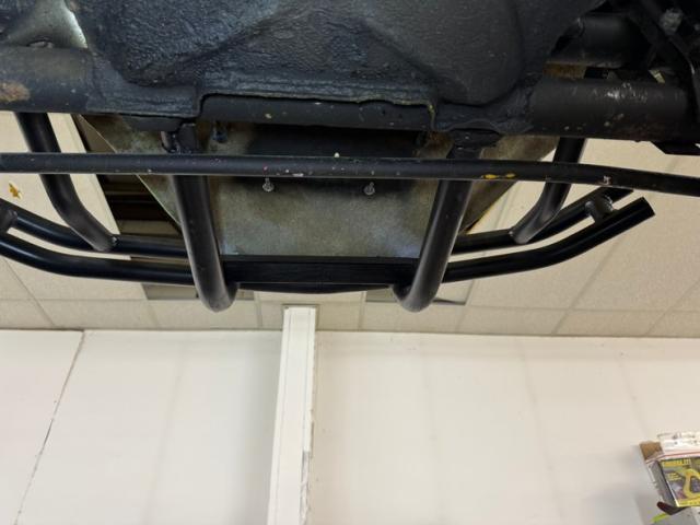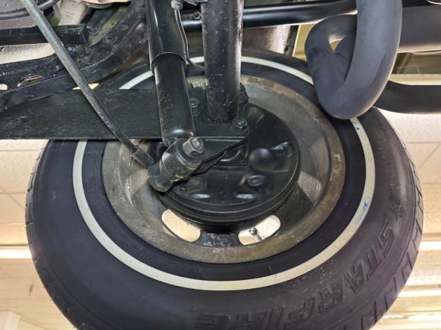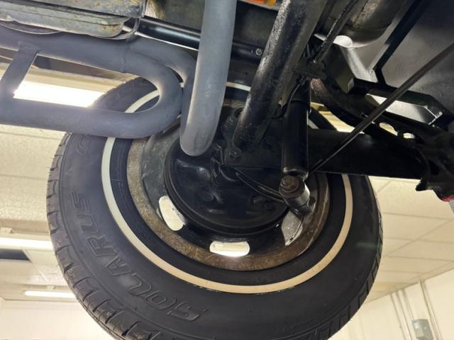 Clean, driver quality underneath with lots of belly pan real estate and tubular framing. The dual exhaust has no mufflers on board and exits through two tips out back. Disc brakes up front and drums in the rear while both front and back suspension is independent with a transverse torsion bar up front and semi trailing arm and transverse torsion bar in the back.