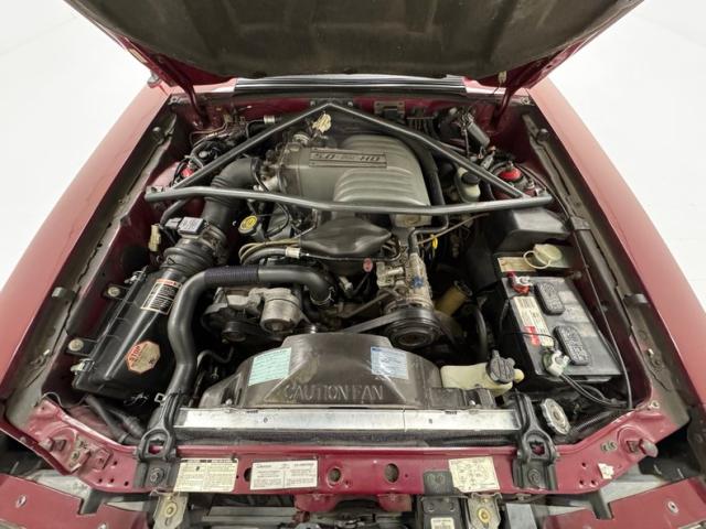 A triangular strut tower brace is mounted over the 5.0 liter fuel injected V8, rated at 225 horsepower and mated to a T5 5-speed manual transmission, now with a King Cobra clutch. Power is routed to the Ford 8.8\" rear with 3.08 gears and TracLoc. The bay presents cleanly and of course, features the racy intake manifold synonymous with the five liter of the time.