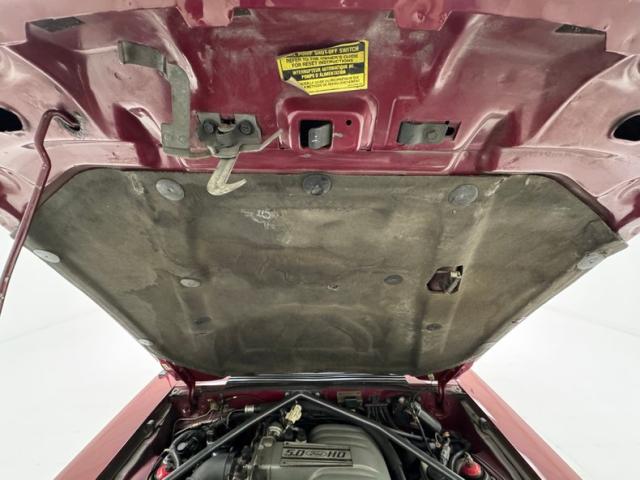 Nothing flashy about the paint, it\'s two stage Cabernet Red and like a fine wine, it has aged very well with only a few chips on the front fascia registering as imperfections. 1990 saw many Ford models without the typical grated grille of the past and the Mustang is no exception with front slats that allow air intake above and below the bumper, unobstructed by cross grid structures, presenting and clean and at the time, modern look. Since the mid 80\'s, Mustangs employed flush headlights in line with the bookended marker lights, another feather in their modernity cap. 16-inch Pony wheels in glossy black wear 55 series tires and match the side molding and black canvas soft top, while angle cut dual exhaust and the coveted five liter emblem on the side complete this muscular car with the stout stance.