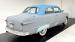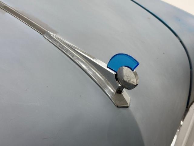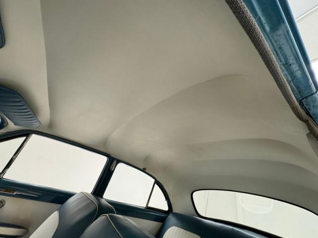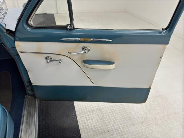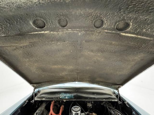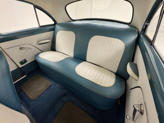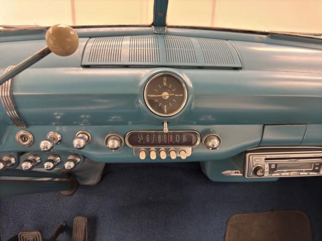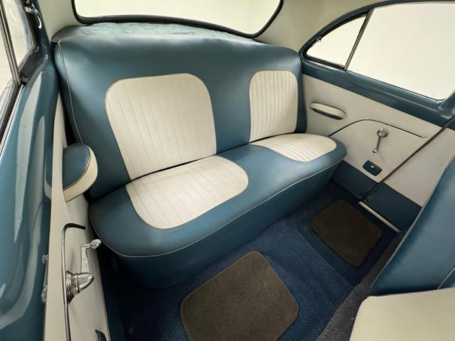 Opening the doors reveals very clean door panels with smooth vinyl in white taking center stage, and sandwiched between light blue steel uppers and light blue vinyl lowers. Nicely done bullet style handles are present, as is a vinyl covered armrest and swoopy chrome trim spear. Looking inward we are met with an inviting bench seat with a split back. These beauties are covered with smooth light blue vinyl bolsters and white tuck and roll inserts. Beautiful gold piping surrounds the edges, and they sit within a perfectly restored blue vinyl covered metal \"tub\" if you will. The rear bench emulates the same tasteful pattern and is also pristine. These benches sit upon a near perfect low pile blue carpeting. Turning our attention to the dash we see a centrally located circular gauge cluster surrounded below by a smattering of chromed knobs and pulls and light blue painted metal. An AM radio in chrome sits in the center of the dash right below a chromed winged circular clock which is mounted to the top of the dash. One more note to the interior, a Magic Air heater is mounted below the dash on the passenger\'s side and just in front of that is a modern AM/FM/CD stereo.