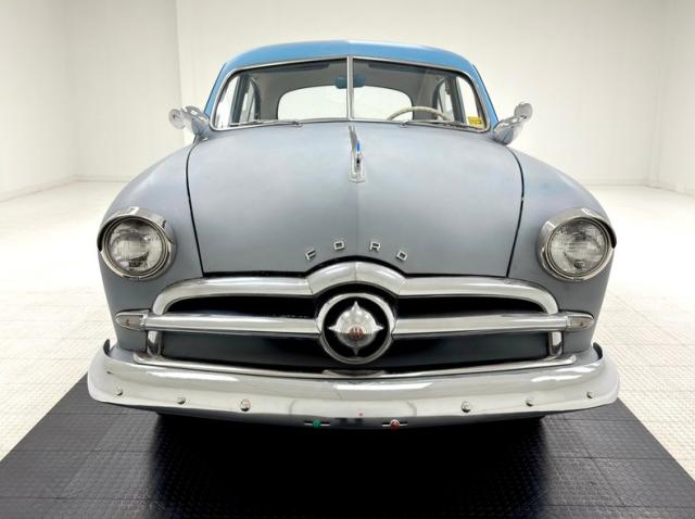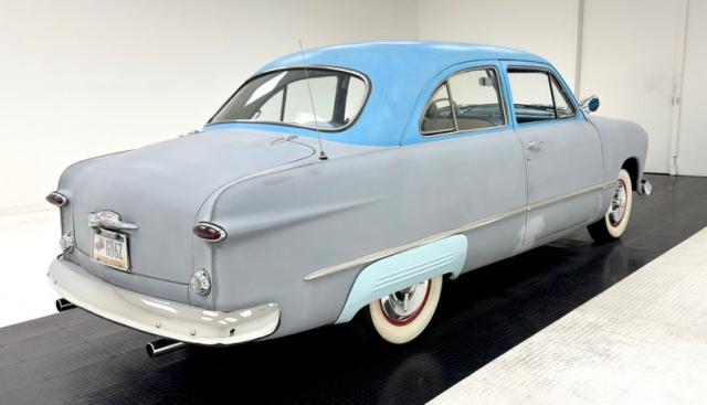 Sitting in its simplified glory we have a nice chromed grille complete with a turbine style central moniker 8 in red. A circular F O R D hovers above and follows the line of the turbine and fronts the massive hood. All mostly straight steel panels, bathed in a coating of gray primer covers this split window, 2 door sedan. Up high bathing the roof is a nicely contrasting satin light blue. A few dings, scratches and scrapes are noted along with paint chips, but hey its primer and it\'s time you dig out the PPG color catalog. Bringing up the rear are two simple oval tail lights, some badging around the trunk lever, and a clean long and no marred bumper. A nice, chromed spear runs just below the belt line, is also pristine, and adds a nice highlight to the steel slab sides. As do the added aqua hued rear fender skirts, giving this car the signature \"low and slow\" look. Wide whites are on all 4 corners, and standard Ford wheel covers in their shining glory are present as well with just a hint of red peeking out at the edges.