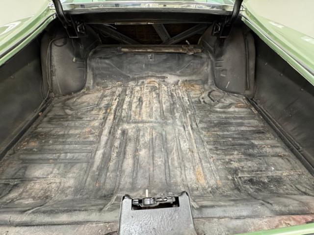 A color change coating of Springmist Green was recently applied and holds its own covering the big steel panels of this large and in charge cruiser. The panels are mostly straight and the paint is nice and consistently applied, and there is a lot of it to look at. The only real faults to note are a scuff on the left corner of the rear bumper and some scratching in the windshield. From the side view it appears as a 2 door spaceship with a swept back B pillar, and long, long trunk and hood and inset bumpers in chrome, it could be moving at warp speed. Adding to the spaceship mystique are the slotted and turbine style wheel covers and 215/70R14 thin white stripe sidewalls all in nearly new 14-inch format. A stainless rocker trim which covers the bottom from the front well rearward continues on the rear quarters and adds a nice highlight to the bottom end of this Starship Enterprise which is perfectly accentuated by the mid body beltline bump out. Areas of interest that are truly noteworthy are the chrome bumper beak and spaceship style tail panel.
