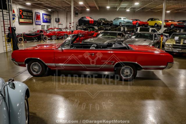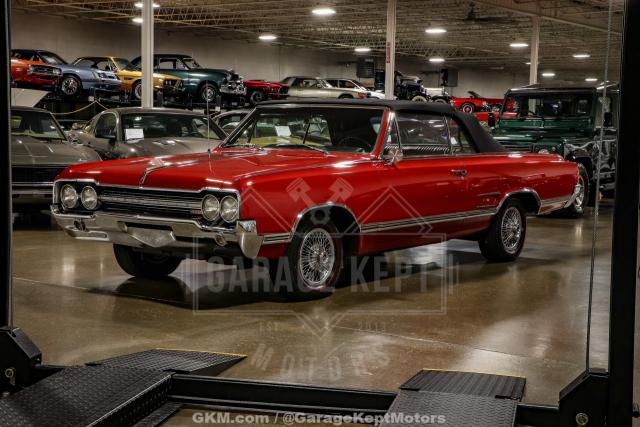 1965 Oldsmobile Cutlass 442 Convertible- Rust Free, Colorado Car- Same Owner for past 16 Years, 3rd Owner- Professionally Restored Summer of 2021- 600 Miles Recorded Since Restoration- Target Red over Black Interior with Black Soft Top- Original and Rebuilt 400ci/345hp 4bbl V8- Jetaway Hydra-Matic Transmission- Factory Options: Power Top, Power Steering, Power Brakes, Vacuum Trunk Release, AM Radio- Extensive Service Records- 8k Miles Shown, TMUThis 1965 Oldsmobile Cutlass 442 Convertible is a beautifully restored example of one of the most iconic muscle cars of the 1960s. A rust-free Colorado car, it has been lovingly cared for by the same owner for the past 16 years, making him just the third owner since new. Professionally restored in the summer of 2021, this 442 has only 600 miles recorded since its restoration, making it a turnkey classic that?s ready for both show and go.Finished in striking Target Red paint over a black interior with a matching black soft top, this 442 has all the visual appeal you\'d expect from a top-tier mid-\'60s convertible. The bodywork is laser-straight, and the attention to detail in the restoration is evident in every panel, trim piece, and finish. The power-operated soft top functions smoothly, and the overall fit and finish speak to the quality of the professional work done during the restoration process.Under the hood is the original, numbers-matching 400 cubic inch V8, rated at 345 horsepower with a 4-barrel to factory specifications. It\'s paired with the Jetaway Hydra-Matic automatic transmission, delivering strong, smooth shifts and classic muscle car torque. This engine setup is what gave the 442 its name and reputation: 4-barrel carb, 4-speed or automatic transmission, and dual exhaust. The car drives as good as it looks, and the sound is unmistakably American.This Cutlass 442 is also equipped with a long list of desirable factory options, including power steering, power brakes, power convertible top, vacuum trunk release, and an original AM radio. These features make the car not just a high-performance icon, but also a comfortable and easy cruiser. Extensive service records accompany the vehicle, documenting its restoration, upkeep, and mechanical integrity over the years.With just 8,000 miles showing on the odometer (true mileage unknown), this 1965 Oldsmobile Cutlass 442 Convertible is a rare opportunity to own a highly restored, well-documented piece of muscle car history. Its combination of originality, factory options, stunning color combination, and careful ownership make it a standout among classic convertibles. Whether you\'re adding to a collection or seeking a show-ready car for summer drives, this 442 checks all the right boxes.