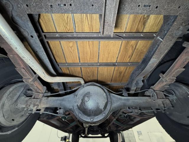 Surface rust dominates the frame except towards the front where it was coated with red oxide primer. We have some oil under the engine and nearby components as well as the rear differential, grease build up in certain areas, not too bad by the knuckles where fresh grease is seen. We note some rust on an inner panel of the cab skirt and on the inner rocker. A single exhaust leaves the engine and runs through a stock style muffler before exiting just before the rear bumper. Leaf springs make up the suspension front and rear.