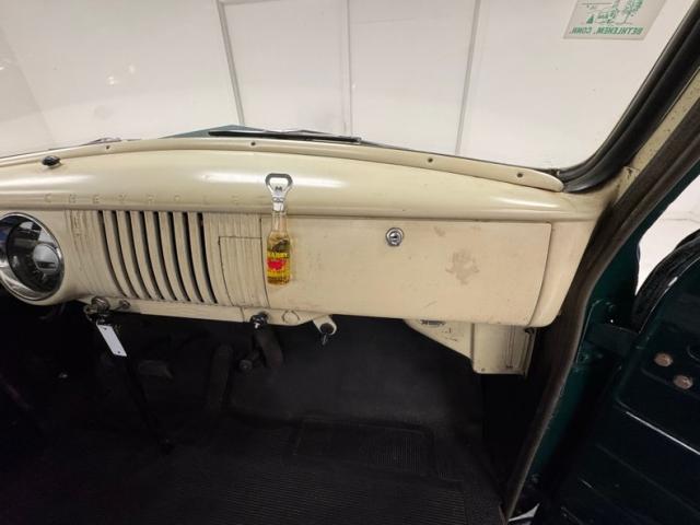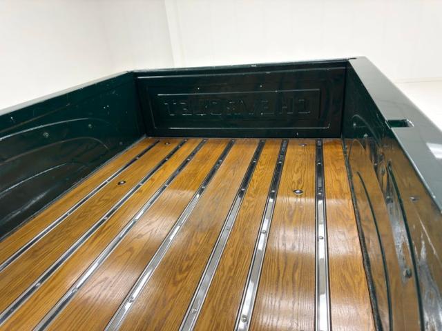 Bermuda Green over Onyx Black is the color configuration, a classic blend of colors that puts a green body over black fenders and running board with single stage coverage that shines pretty well. It\'s the grille and bumper, all in ivory paint, that retain chips and surface rust and stories. The fixed rear window, part of a five window set up, looks over the long bed beautifully finished with honey colored oak planks and stainless rails leading to a tailgate where Chevrolet is embossed and painted in white, flanked by simple round tail lights. 16-inch steel wheels are painted silver, including the spare mounted on the running board. Imperfections include paint chips on the edge of the door, a hole in the running board, a dented scuff on the front fender, and random scratches.