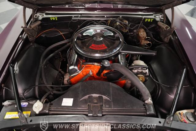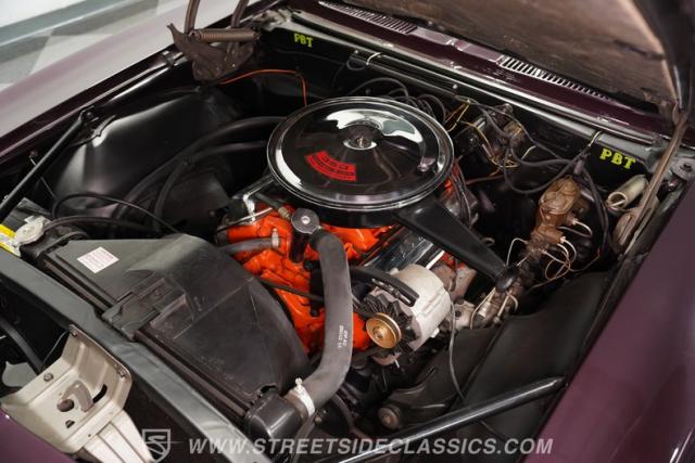 As you raise the hood, don\'t let the stock configuration of the engine compartment lead you to the conclusion that this Chevy hasn\'t seen the attention needed to keep it running in top mechanical form. Its 350-cubic-inch V8 is fed by a 4-barrel Quadrajet carburetor and is running smooth and strong, sending a nice, rich note out of the dual exhaust and combining with a 2-speed automatic Powerglide transmission to provide an outstanding experience behind the wheel. Power steering makes this vintage muscle car easy to maneuver, and the upgraded suspension that comes via its elevated Super Sport status yields strong cornering ability.