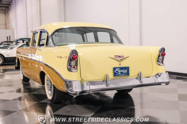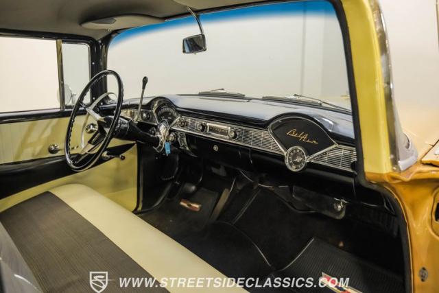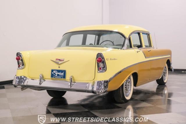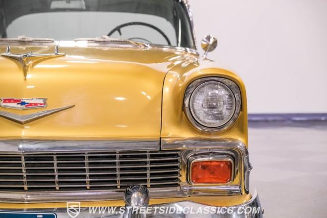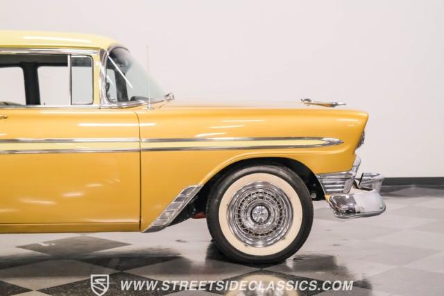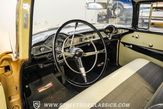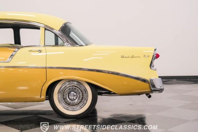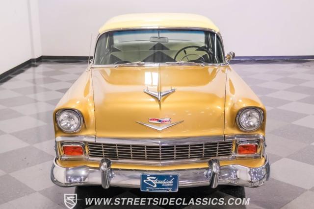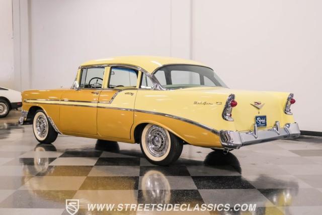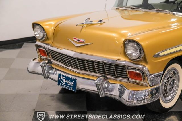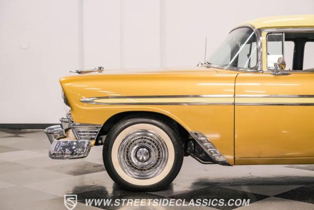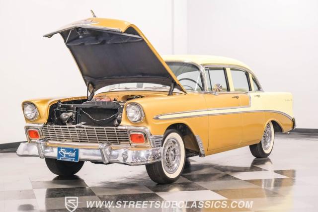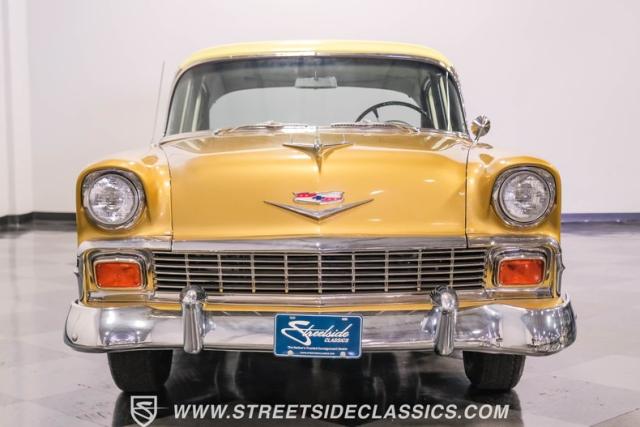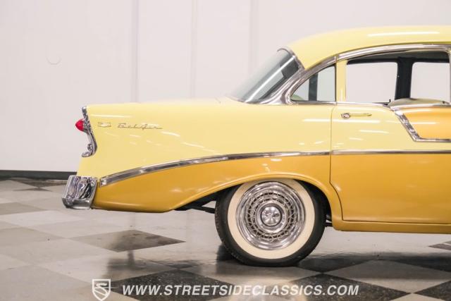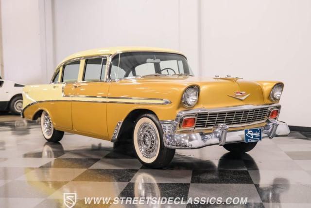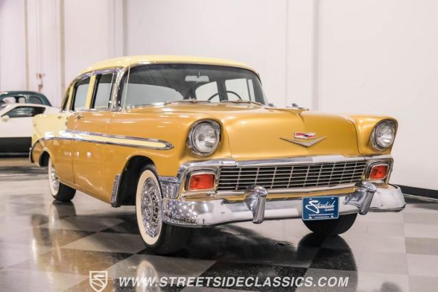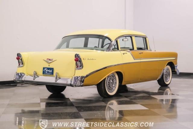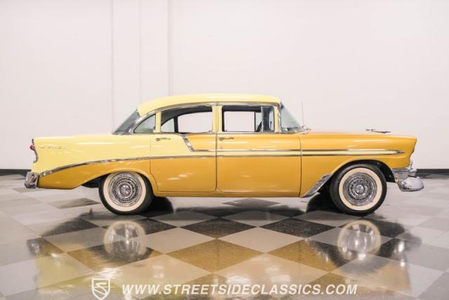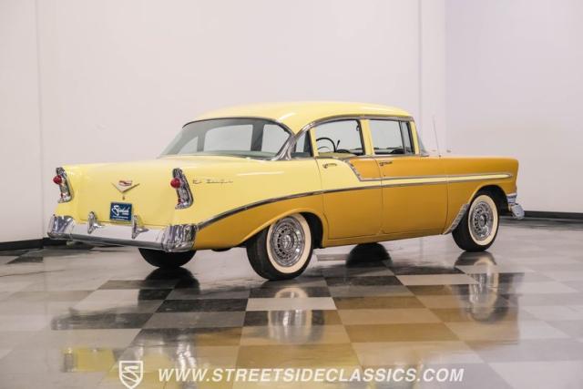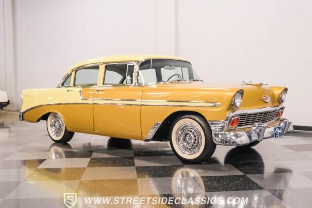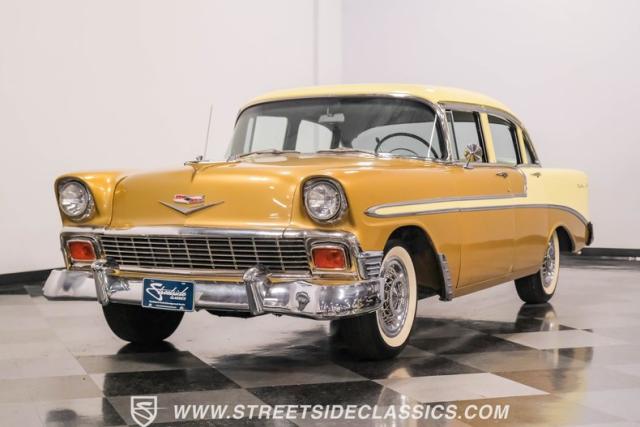 With its bold Grecian Gold and Calypso Cream two-tone (and factory correct) paint job, this 1956 Chevrolet Bel Air 4 Door Sedan is a true standout. The full-length trim accentuates the car\'s lines, creating an unbroken streak that flows seamlessly along the body. It\'s a design exclusive to the \'56 Bel Air, and on this meticulously restored sedan, the doors align perfectly, showcasing the attention to detail that went into every inch of this classic. Rolling on 205/75R15 white wall tires wrapped around 15\" wheels with chrome hub caps, this Bel Air is sure to impress wherever it goes.