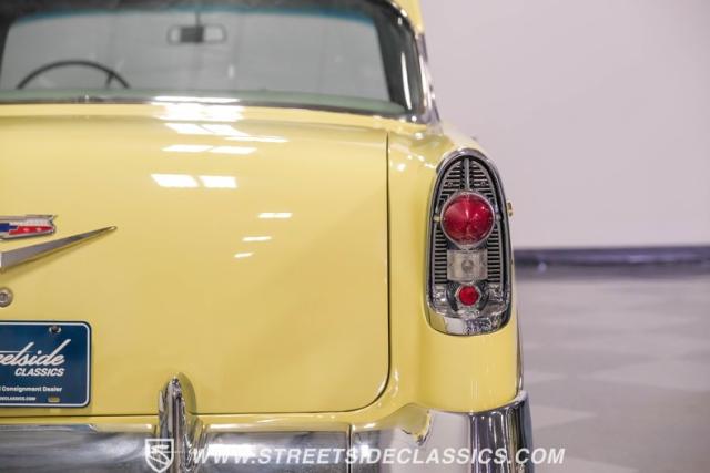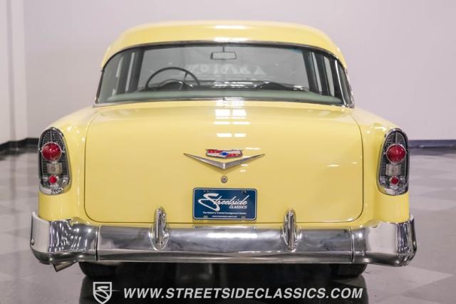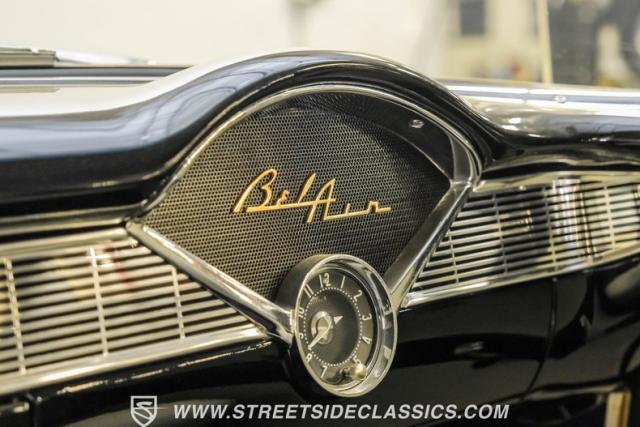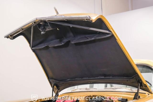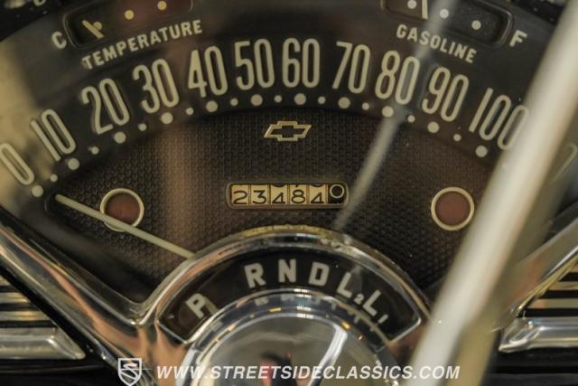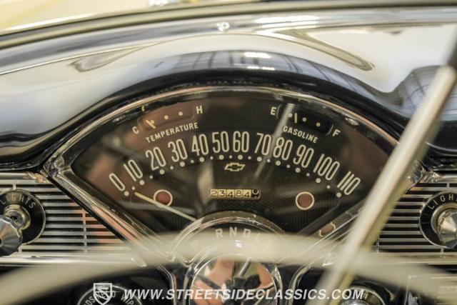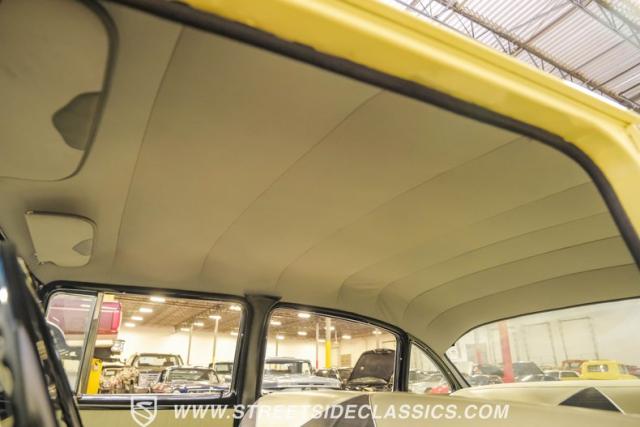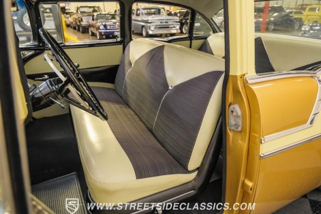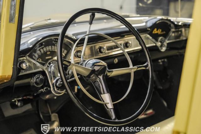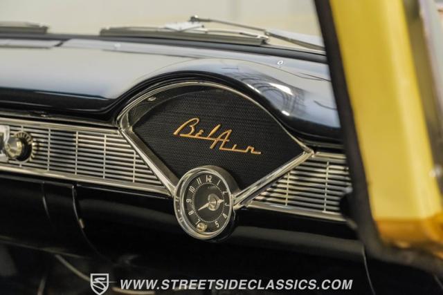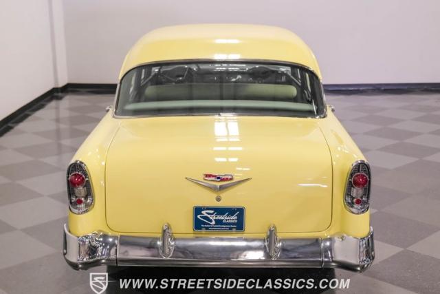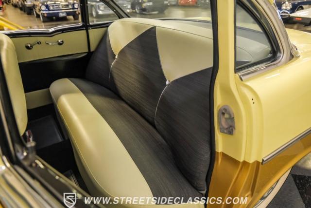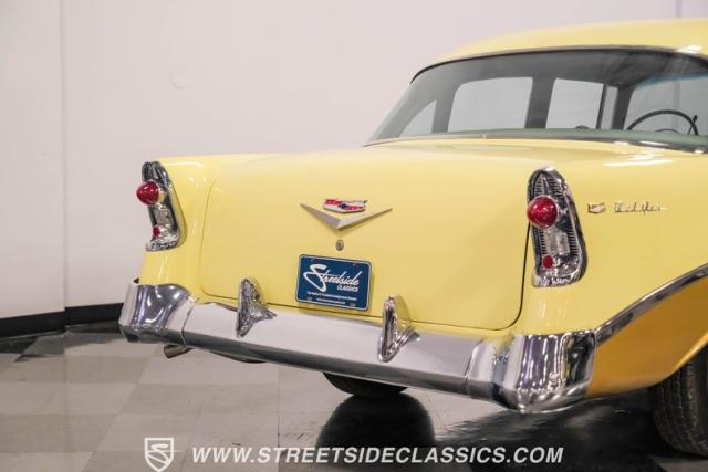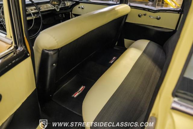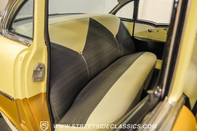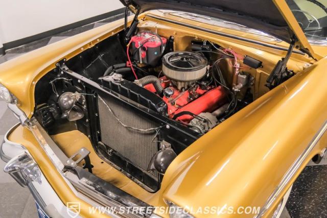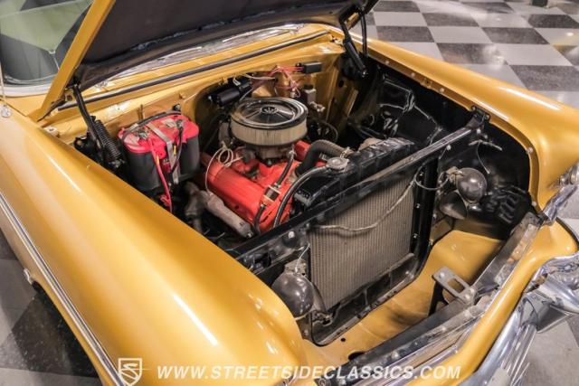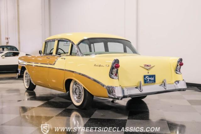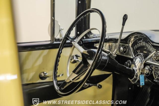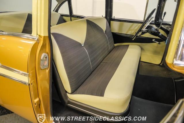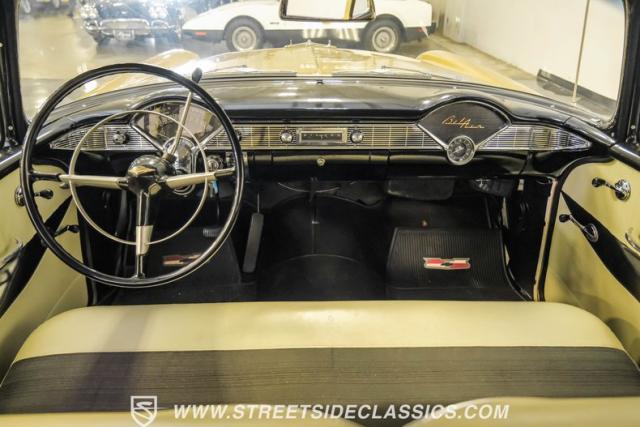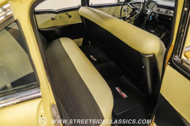 With its bold Grecian Gold and Calypso Cream two-tone (and factory correct) paint job, this 1956 Chevrolet Bel Air 4 Door Sedan is a true standout. The full-length trim accentuates the car\'s lines, creating an unbroken streak that flows seamlessly along the body. It\'s a design exclusive to the \'56 Bel Air, and on this meticulously restored sedan, the doors align perfectly, showcasing the attention to detail that went into every inch of this classic. Rolling on 205/75R15 white wall tires wrapped around 15\" wheels with chrome hub caps, this Bel Air is sure to impress wherever it goes.