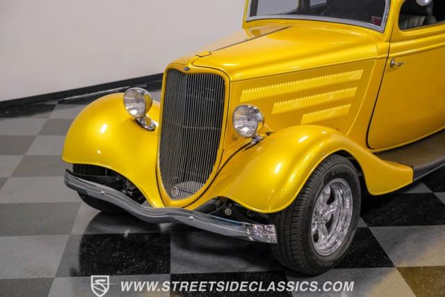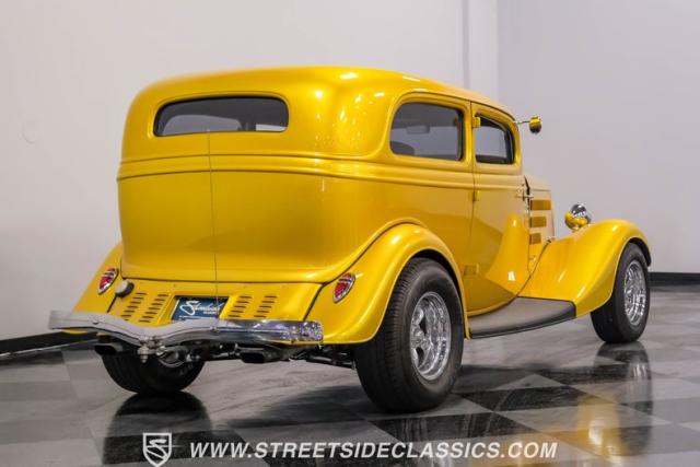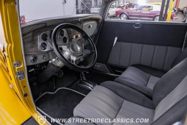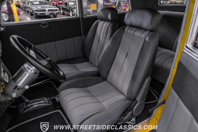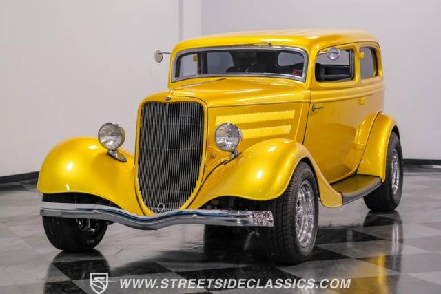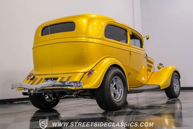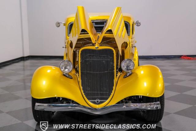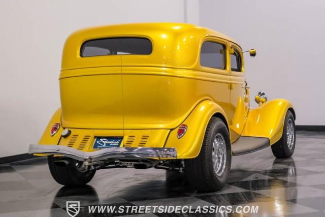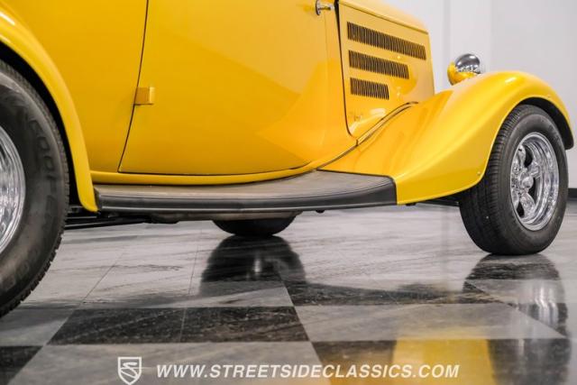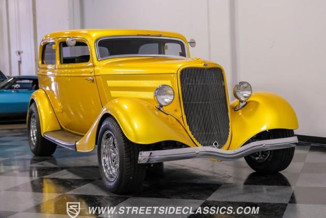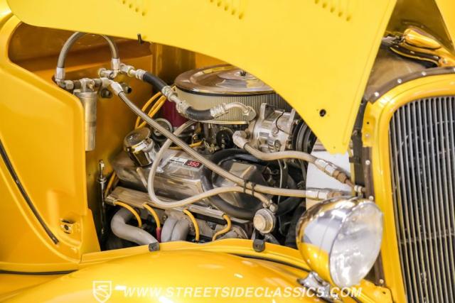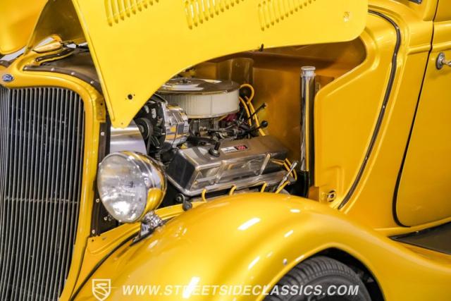 This 1933 Ford Victoria Streetrod is a golden bullet on wheels, ready to dominate the streets and car shows alike. The metallic gold paint job gleams in the sunlight, accentuating every curve of its all-steel body while the chopped Chevy wagon roof adds a unique twist to this classic silhouette. Rolling on 15\" American Racing wheels wrapped in 215/65R15 front and beefy 255/70R15 rear tires, this Ford\'s stance is aggressive and purposeful.
