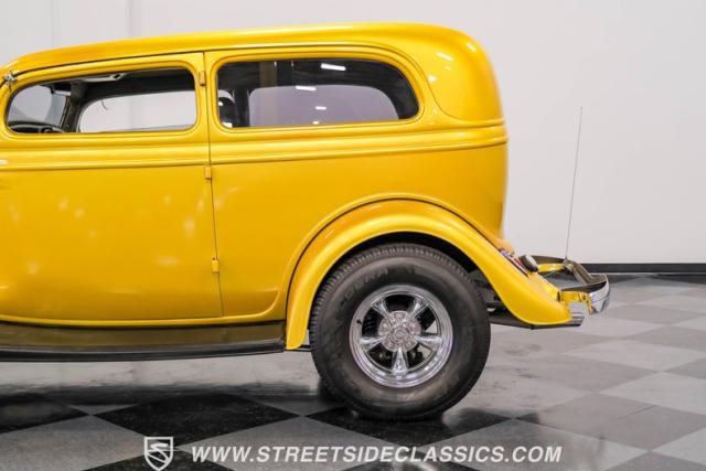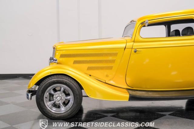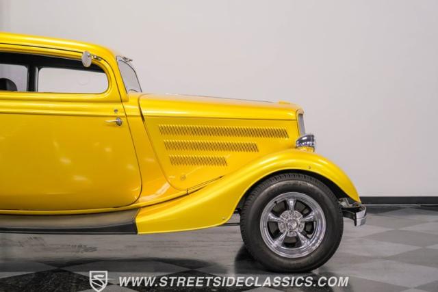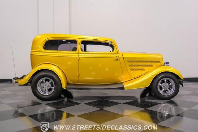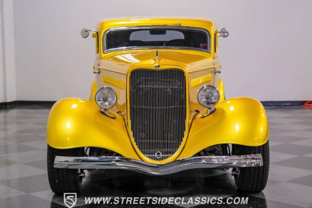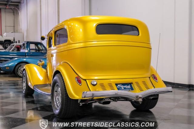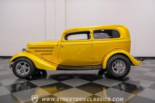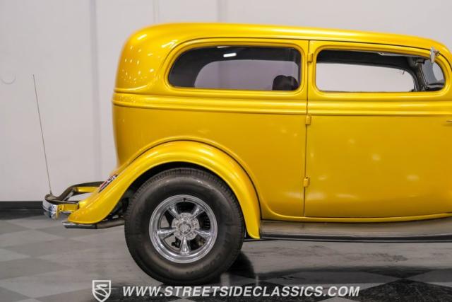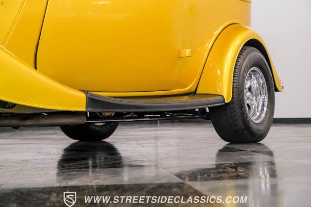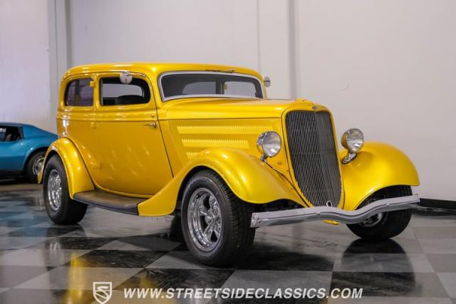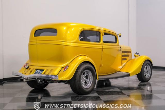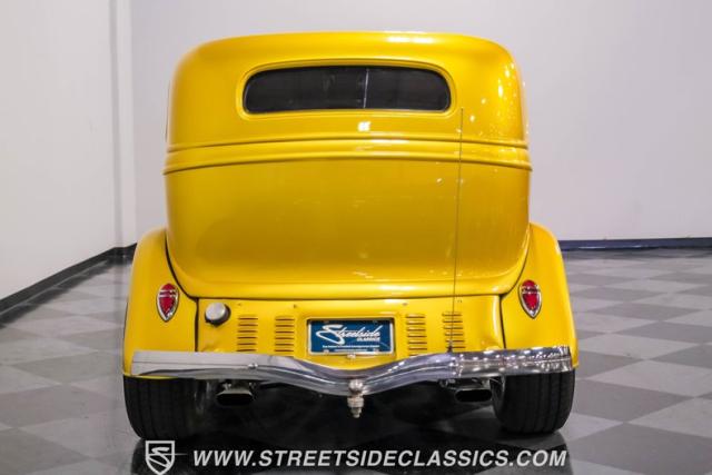 This 1933 Ford Victoria Streetrod is a golden bullet on wheels, ready to dominate the streets and car shows alike. The metallic gold paint job gleams in the sunlight, accentuating every curve of its all-steel body while the chopped Chevy wagon roof adds a unique twist to this classic silhouette. Rolling on 15\" American Racing wheels wrapped in 215/65R15 front and beefy 255/70R15 rear tires, this Ford\'s stance is aggressive and purposeful.