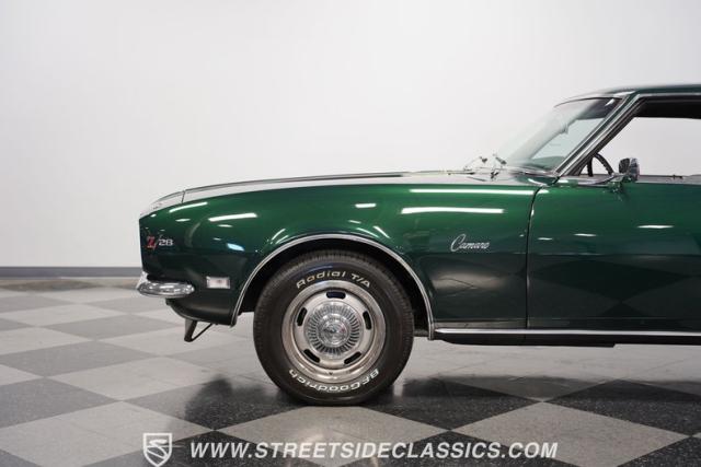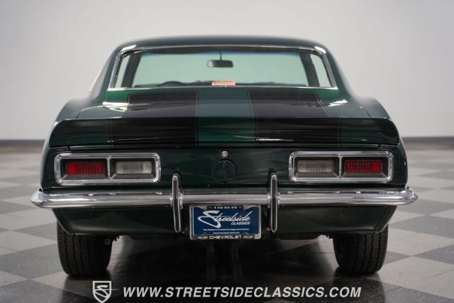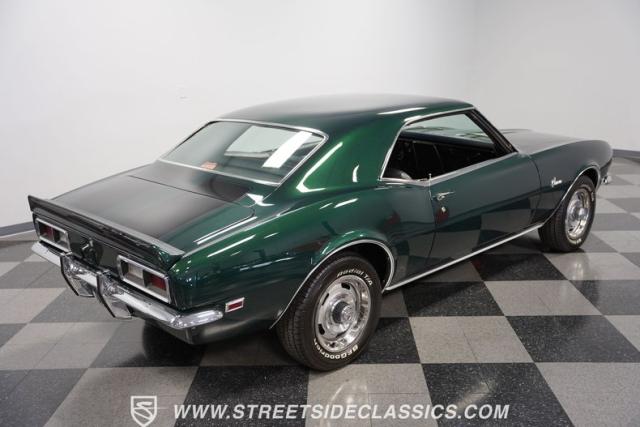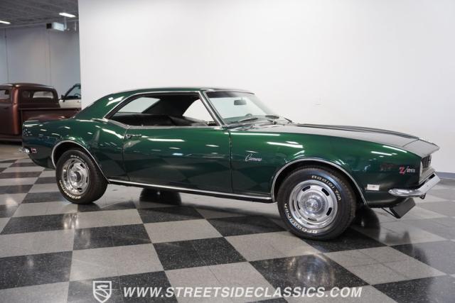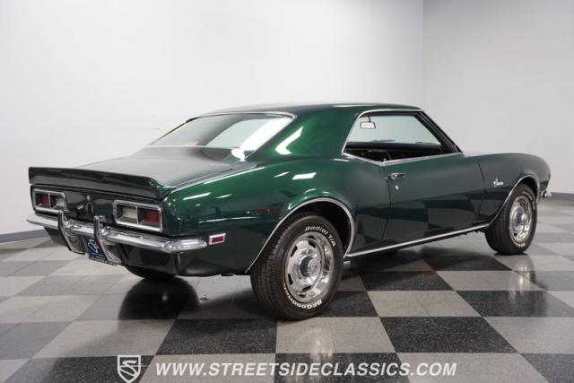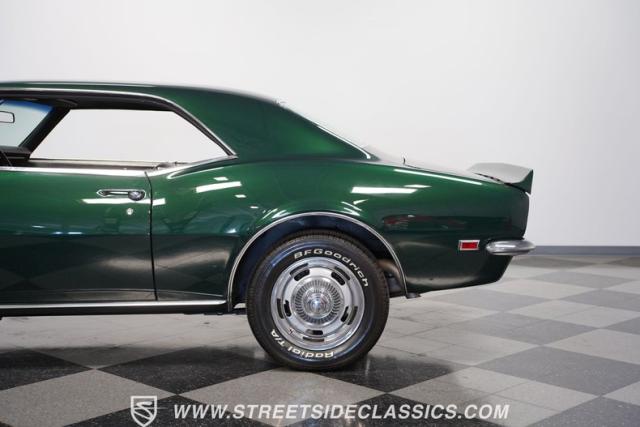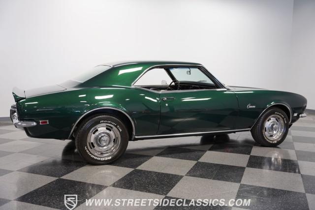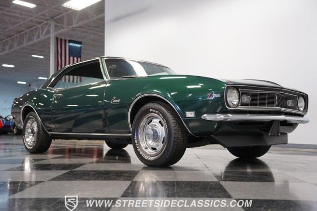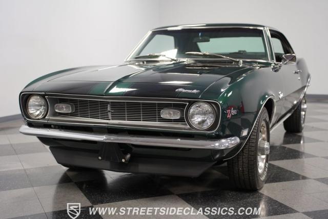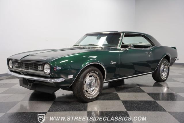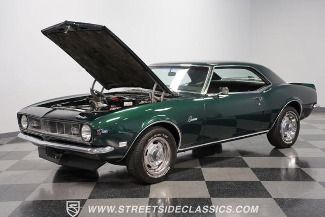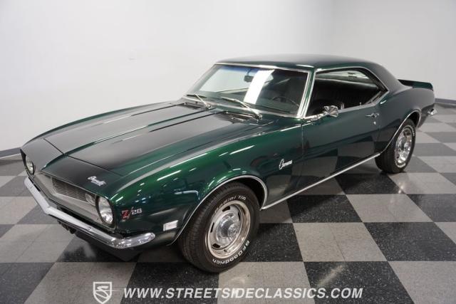 This 1968 Chevrolet Camaro Z/28 exudes a classic muscle car attitude. Its dark green metallic paint is adorned with bold black racing stripes a timeless combination announcing its performance pedigree. Though not original to this car, details like the cowl air intake, a feature unique to early Z/28s, signal this Camaro\'s dedication to speed. This Z/28 sits on the perfect set of wheels 15-inch Rallys wrapped in classic 215/65R15 BFGoodrich Radial T/As.
