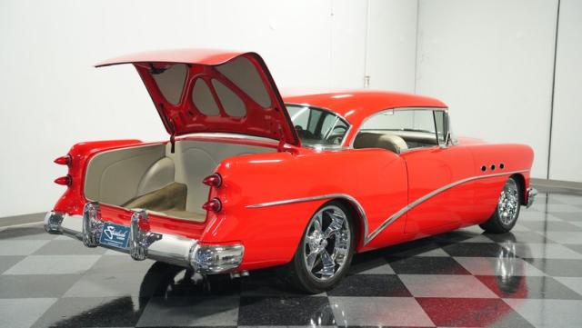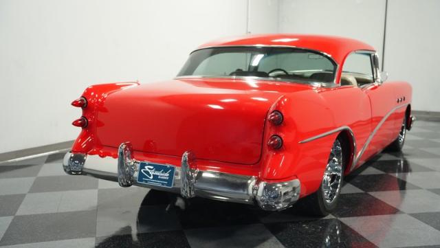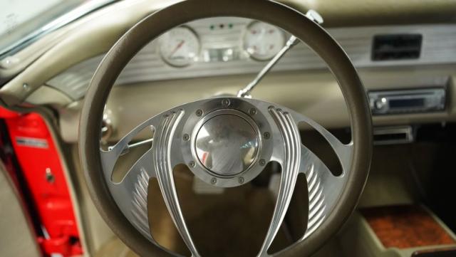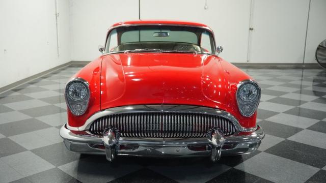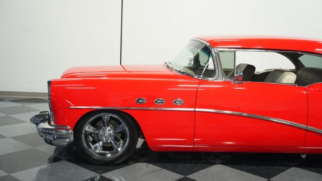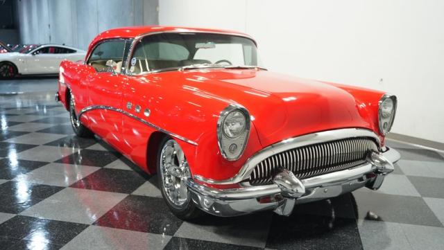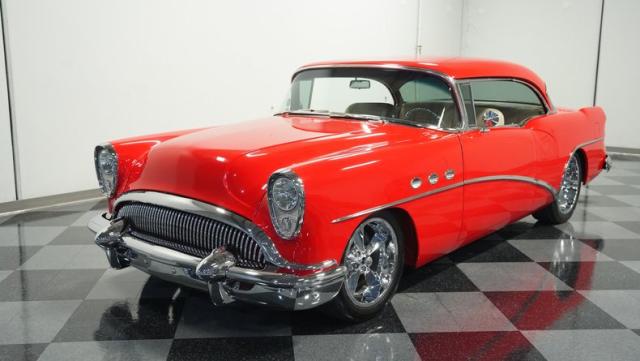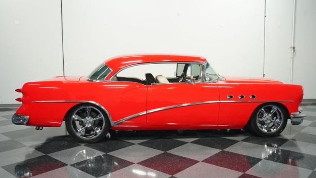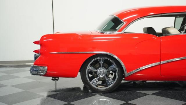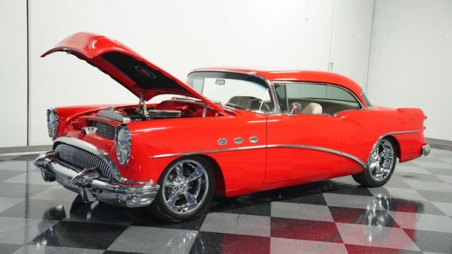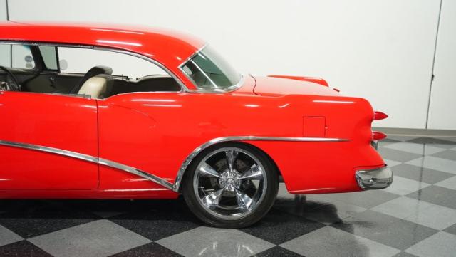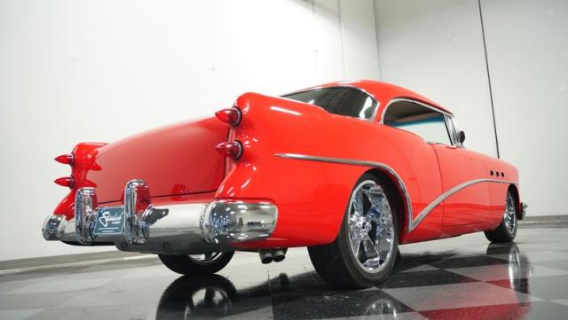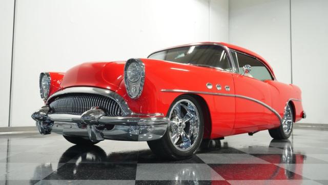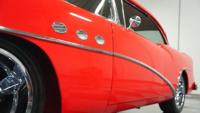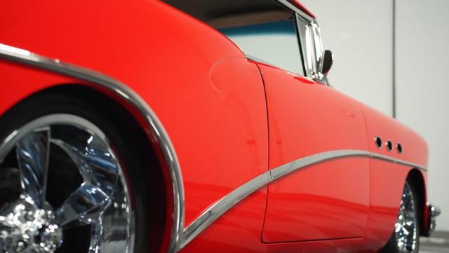 This 1954 Buick Special Riviera Restomod graced the pages of Motor Trend magazine, showcasing its exceptional build quality. The Ferrari Red paint electrifies the senses, while custom touches like emblem delete, clear headlights, and Cadillac-style bullet taillights set it apart. The Buick\'s aggressive stance comes courtesy of 18\" front and 20\" rear Boyd Coddington wheels, wrapped in 235/50ZR18 front and 285/45ZR20 rear tires.