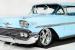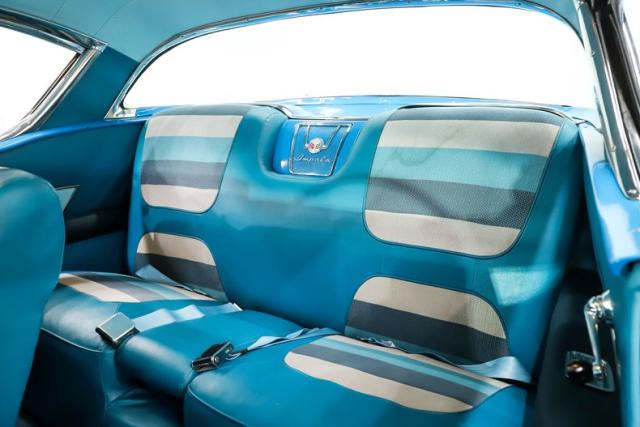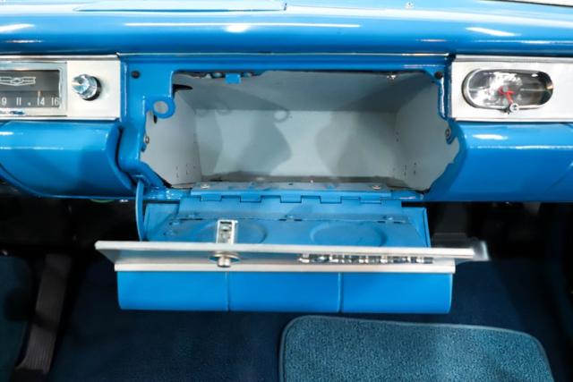 EXTERIOR: Every panel of this car has intriguing style! It\'s a clean, straight body that fits nice. Repainted its original color: Cashmere Blue and it has a glossy finish. The chrome and trim are straight and shiny and there\'s no shortage of trim! It even has optional dual antenna. New windshield and weatherstrips. Correct T-3 headlights. It\'s squatted down and looking really sharp on some staggered size Billet Specialties wheels, they\'re 18s in front, 20s in back.