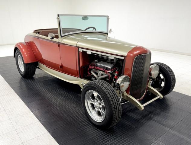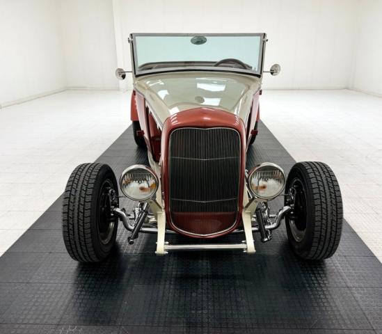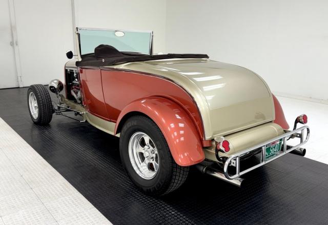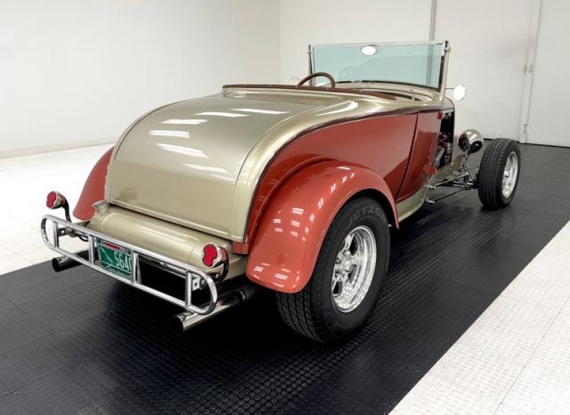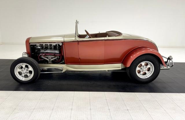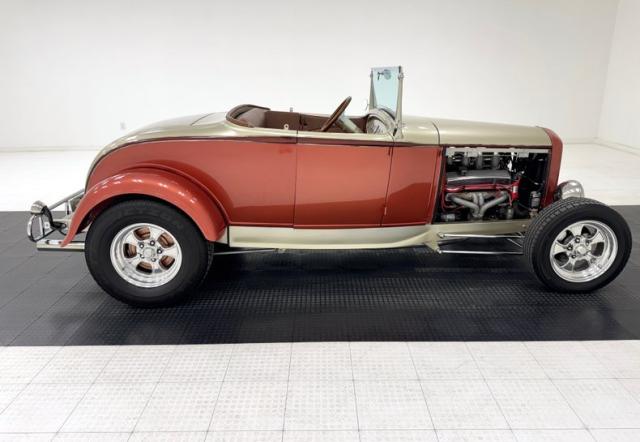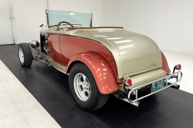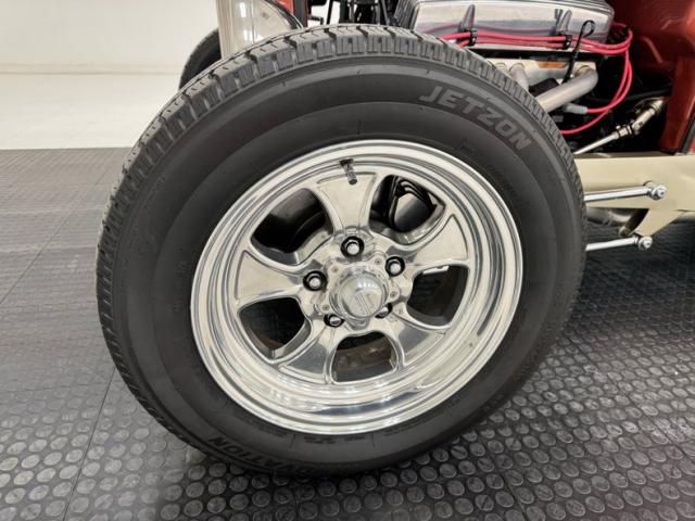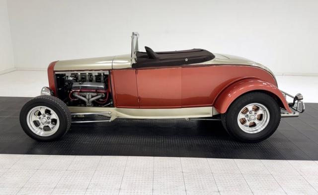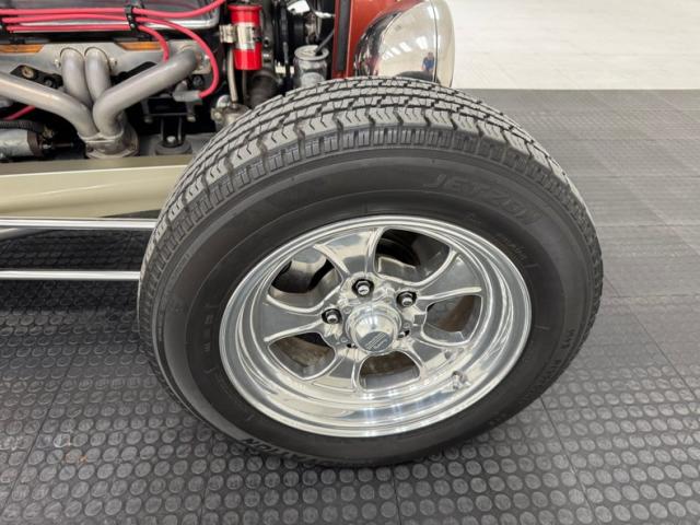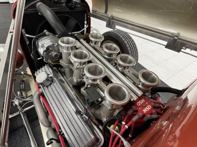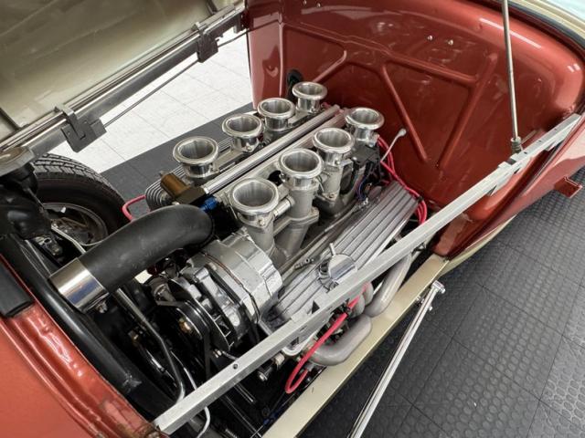 The classic lines are truly accentuated by the dispersal of Champagne Metallic paint that sandwiches the Light Persimmon Metallic middle delineated by a pewter edge dark band on top, and it\'s stunning. The \'32 grille shell wears the persimmon as do the rear fenders in the back, it has all the appeal of a classic configuration here in modern, two stage application. Modest tail lights reside over a tubular rear bumper and big, dual polished tips and if the paint didn\'t clue you in to the build, these features might. The wheels, which are 15-inch American Racing units, wear staggered tires that apply the classic raked look to the car and an exposed engine is about as hot rod as you can get! A vertical windscreen has a bottom edge that follows the gentle contour of the cowl and protects the open cabin. Imperfection includes some scratches and chips and some staining at the fuel filler.