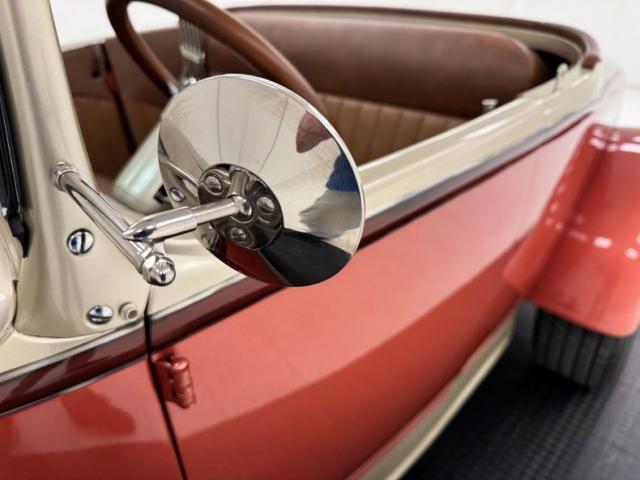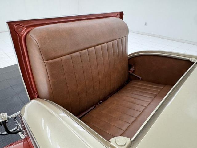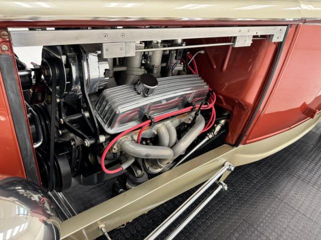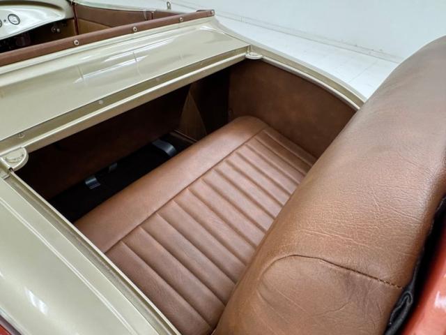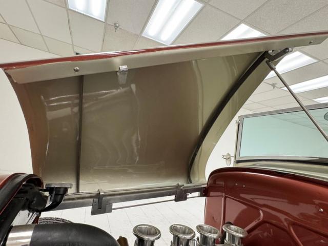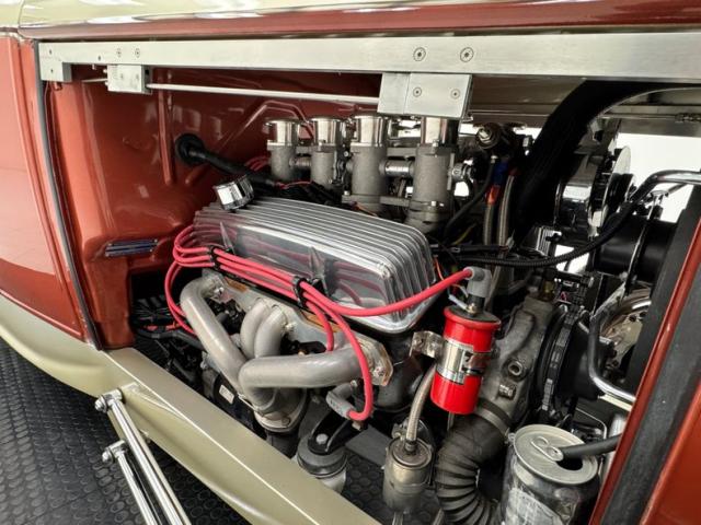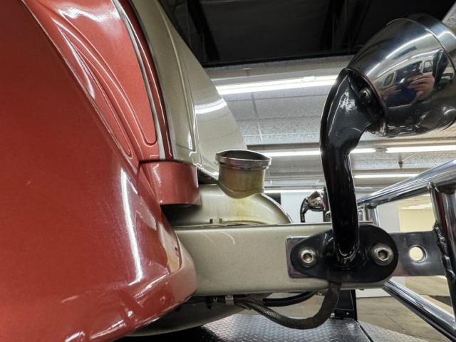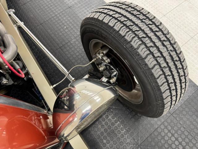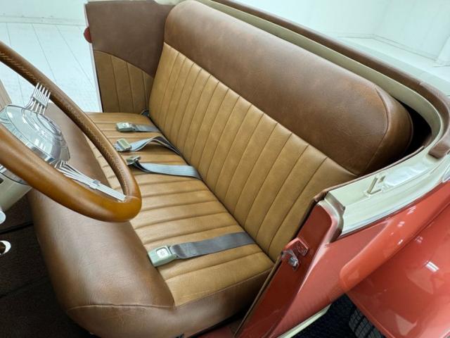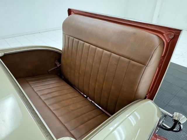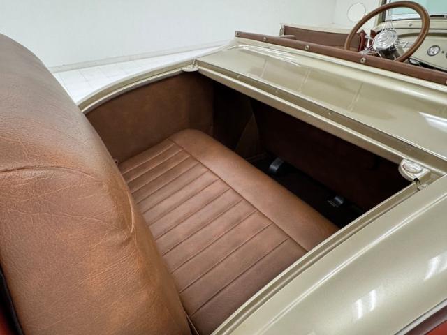 Two tone is adopted on the inside with two shade brown vinyl beginning on the door panels, handsome and clean, and continuing on Glide bench seat with stitched inserts in saddle borders. The banjo style steering wheel is also attractive, wrapped in brown leather ahead of a champagne dash housing white faced AutoMeter gauges in a spotless horizontal presentation. The piston shaped shifter handles rides a polished shaft that dives into a saddle boot right beside the floor mounted hand brake over low pile brown carpet. The interior space expands when you lift the rumble seat, here dressed in clean, saddle vinyl against a persimmon painted hatch.