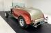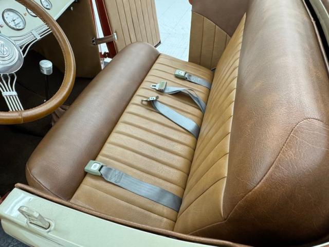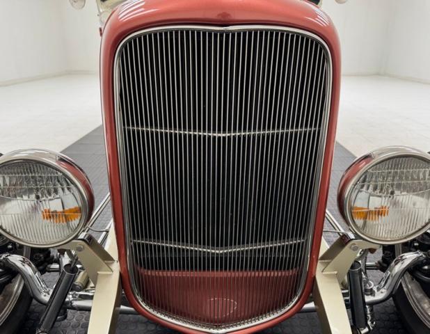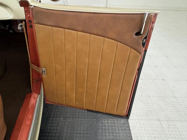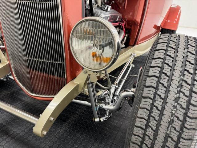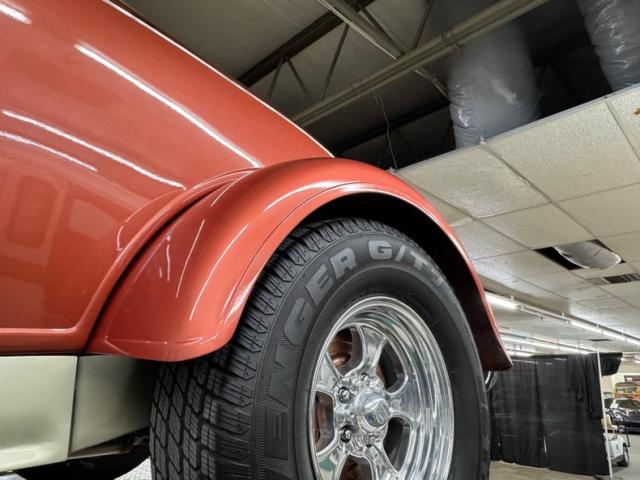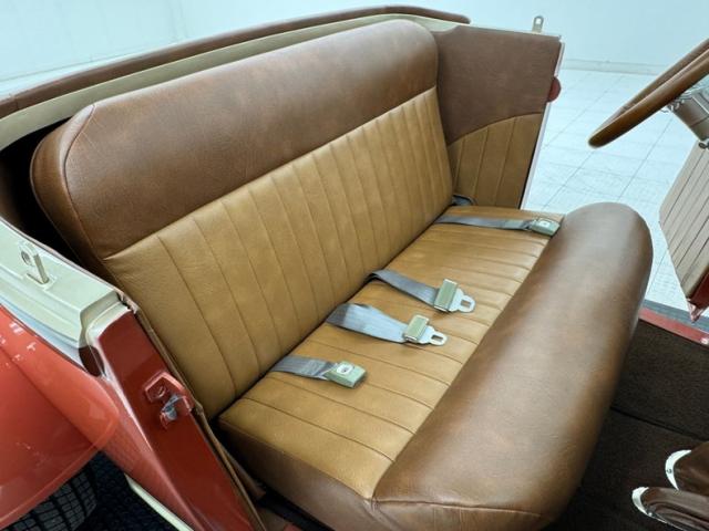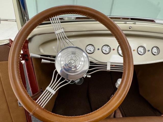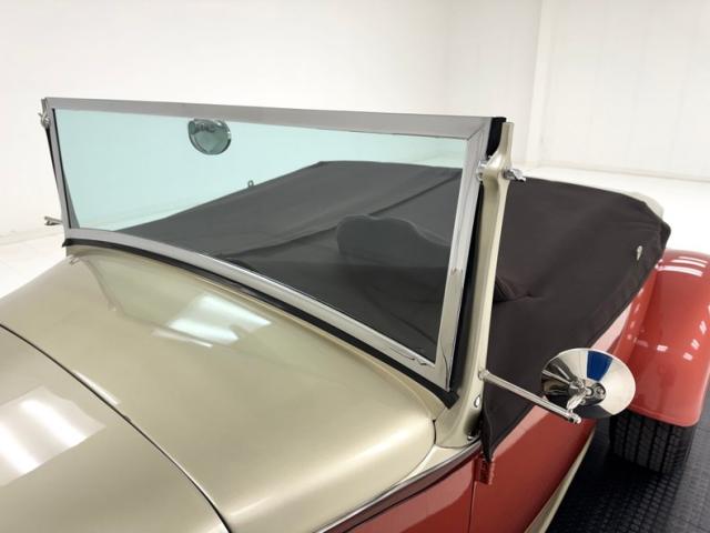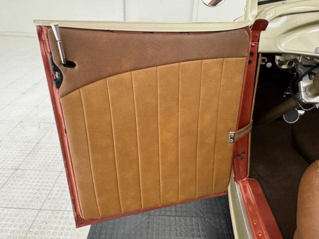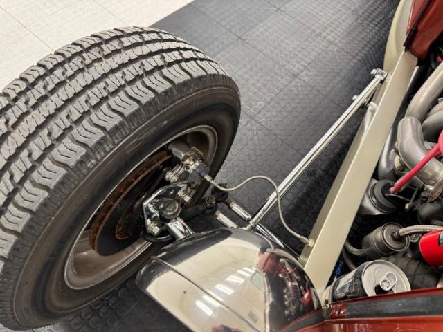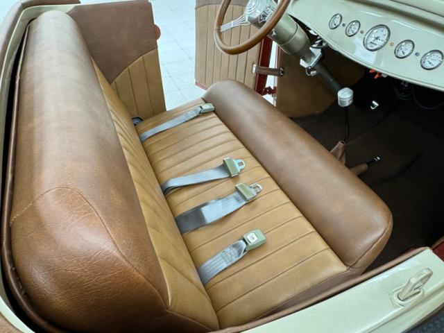 Two tone is adopted on the inside with two shade brown vinyl beginning on the door panels, handsome and clean, and continuing on Glide bench seat with stitched inserts in saddle borders. The banjo style steering wheel is also attractive, wrapped in brown leather ahead of a champagne dash housing white faced AutoMeter gauges in a spotless horizontal presentation. The piston shaped shifter handles rides a polished shaft that dives into a saddle boot right beside the floor mounted hand brake over low pile brown carpet. The interior space expands when you lift the rumble seat, here dressed in clean, saddle vinyl against a persimmon painted hatch.