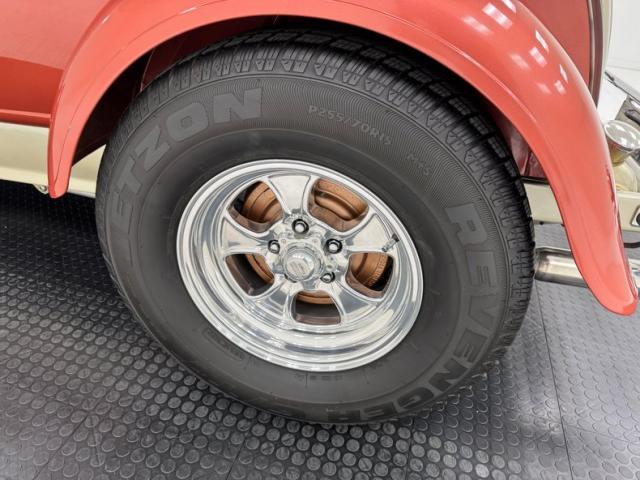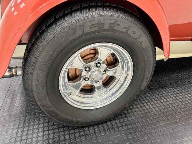 As one would expect, things are pretty clean underneath with lots of polished suspension and steering components along with a painted rear axle polished pans and we\'re not deterred by the single drop of oil on each. Meanwhile, we have disc brakes up front, drums in the back and suspension includes transverse leaf spring up front with Bilstein shocks, and 4-link with coil overs in back. The dual exhaust comes from the headers and flows through MagnaFlow mufflers before finding their way to the back.
