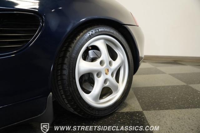 This 1999 Porsche Boxster in Ocean Blue Metallic carries itself with a low-slung stance thanks to H&R adjustable coilovers and matching H&R sway bars. The factory 17-inch alloy wheels are wrapped in Michelin Pilot Sport AS/3 tires, 205/50ZR17 up front and 255/40ZR17 in the rear. The power-operated blue canvas top keeps everything tight above, and the clean lines front to rear stay true to the mid-engine shape that defined the Boxster\'s identity.