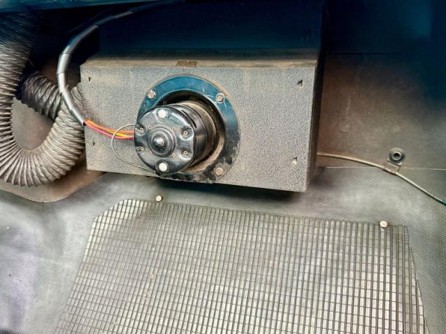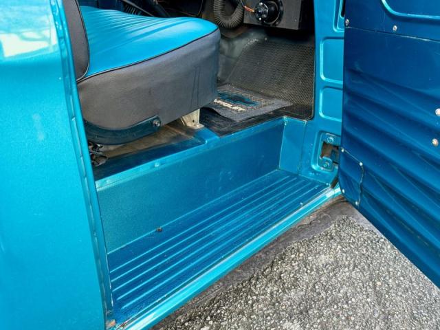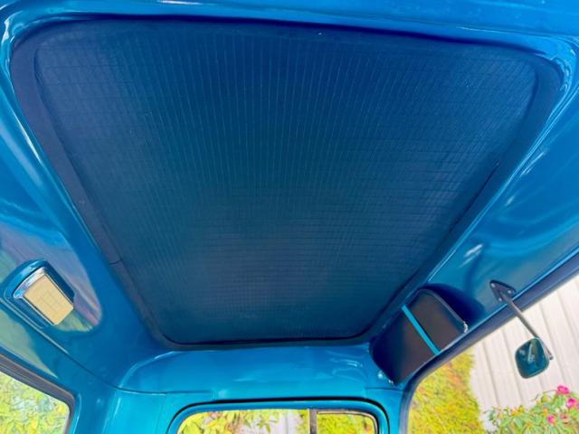Interior: The interior is well-maintained and features a striking color scheme. The seat base and back are finished in turquoise, complemented by black sides and a black padded headliner.