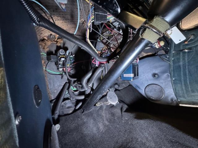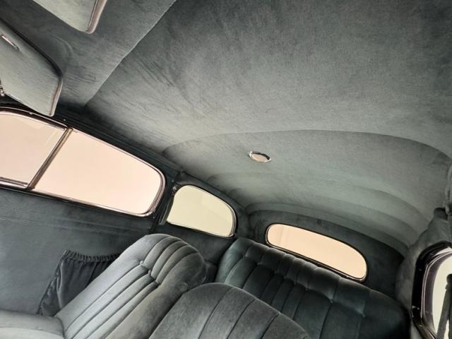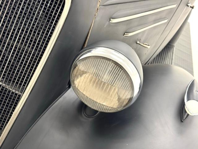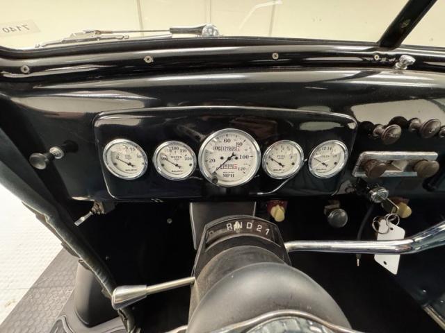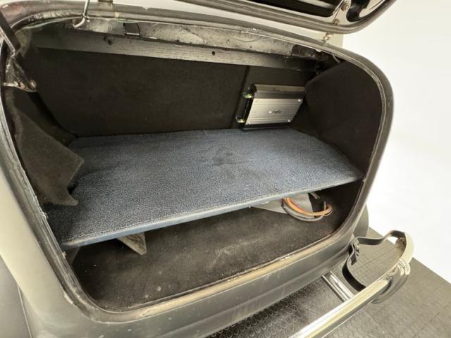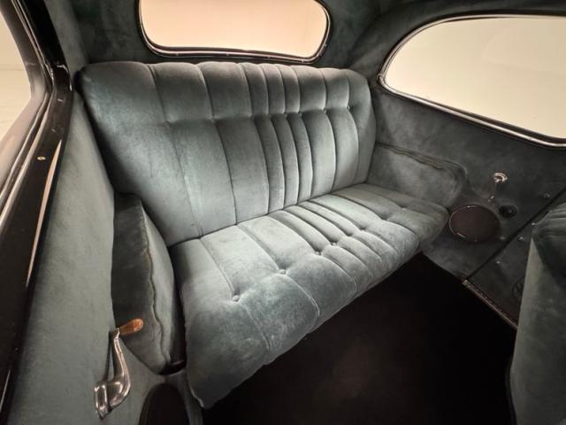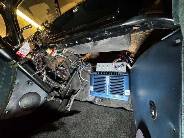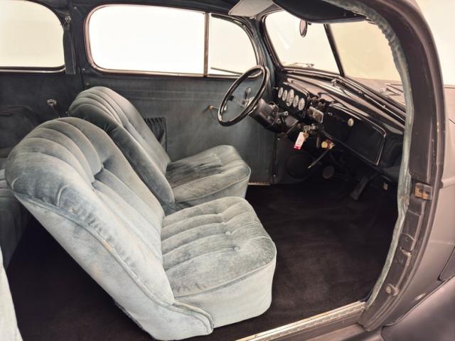Light blue mohair door panels retain original hardware and hold a bit of patina mostly in the form of discoloration as they are otherwise intact. Column tufted cloth bucket seats in front have that living room welcoming feel, showing a bit of wear while the rear bench in the same material, enveloped in a blue cloth cocoon, has a nap inducing level of comfort. Definitely grandma\'s house. A street rod type steering wheel fronts a clean black dash housing white faced AutoMeter gauges just behind the column shifter. Back to 1935 we go to the center where brown bakelite knobs are accompanied by an epically cool original radio which now channels Bluetooth capabilities! There\'s heat underneath along with black carpet in fine condition with a puffy blue headliner up above. The trunk contains a carpeted shelf and is relatively clean.