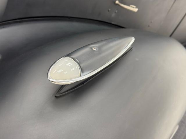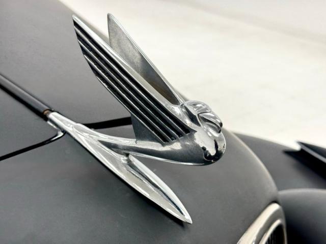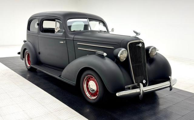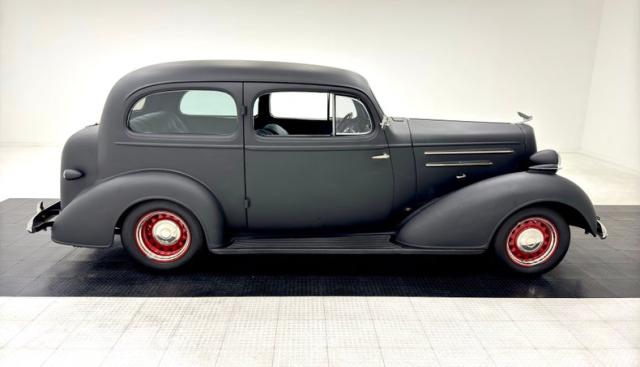 The 1935 brochure boasted \"longer wheelbase, roomier bodies\" and indeed, this grand car is large and tall and its humpback \"luggage locker\" adds to the dimensions and girth. The fantastic two door is dressed in matte black paint and if not for the red wheels, would look not unlike the black and white images from early television. Speaking of the wheels, these are 15-inch \"artilliary style\" wheels with polished rim and dog dish caps, staggered width, and wearing staggered size tires. Adding some more drama to the car is the forward leaning hood ornament which is ambiguously part man, part bird, but definitely winged. Torpedo marking lights ride the outstretched front fenders while a pair of round taillights are accompanied by a single stop light under the plate bracket. Dual exhaust under the chrome bumper hint at some modification and suicide style doors over a wide running board add to the unique desirability. Imperfections include a rough spot and scratches in the paint and some rust on the rocker panel.
