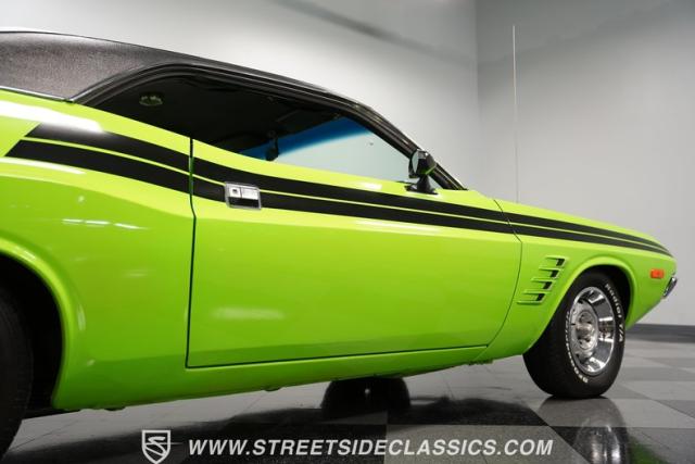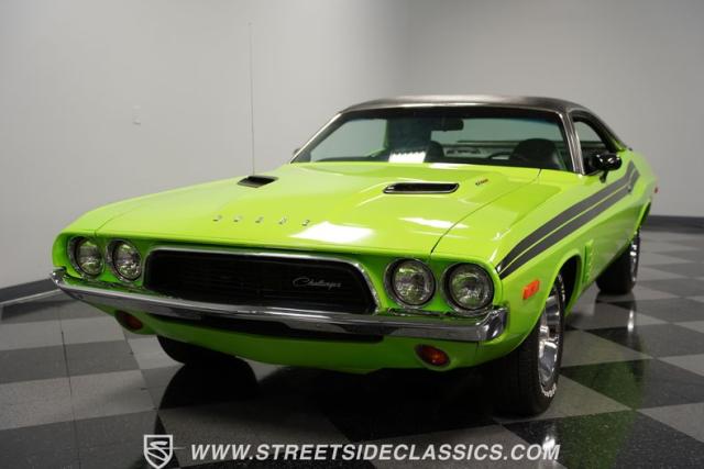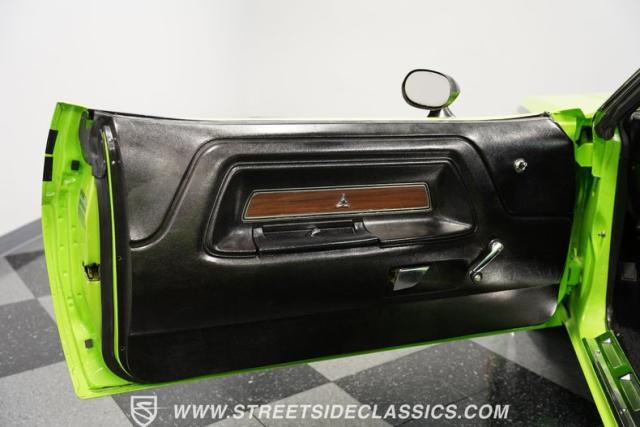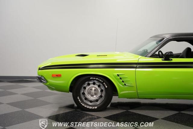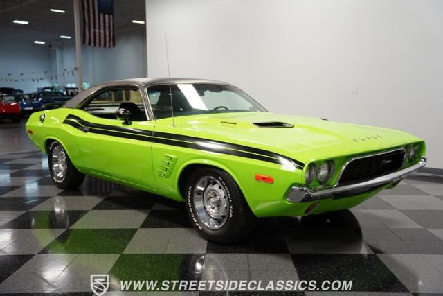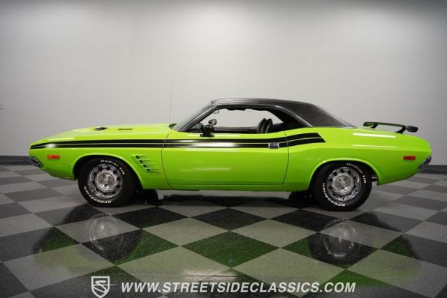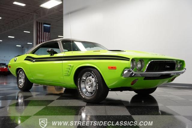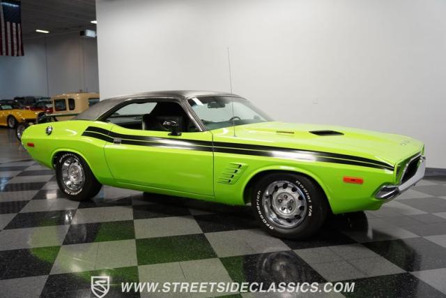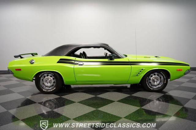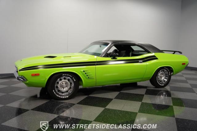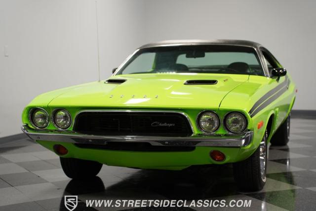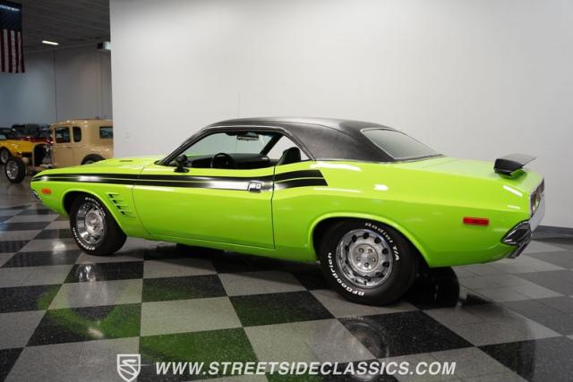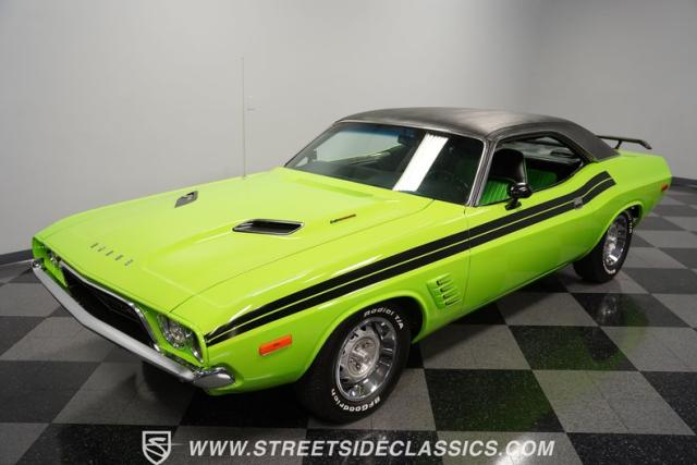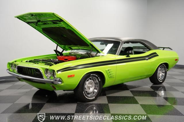 This 1973 Dodge Challenger Rallye roars with personality, showcasing a dazzling Lime Green exterior that captures the spirit of its era. The black vinyl top adds a classic touch, contrasting beautifully with the bold green paint. The Rallye package includes striking black decals that run along the sides, enhancing its aggressive stance. Sitting on 15-inch Mopar Rallye wheels wrapped in 215/70R15 front and 235/70R15 rear BFG Radial T/A tires, this Challenger looks ready to conquer any road. The dual racing mirrors and rear deck spoiler complete the picture, making this a true standout among muscle cars.