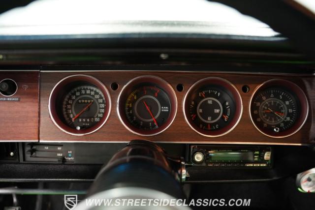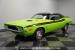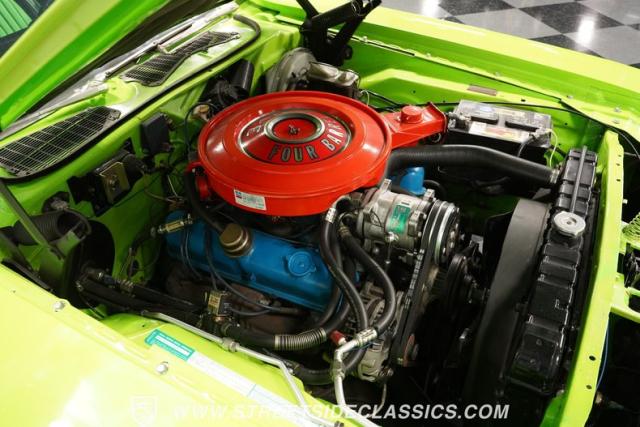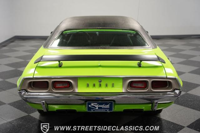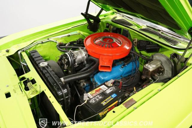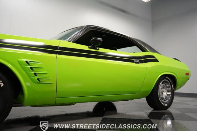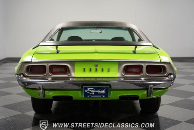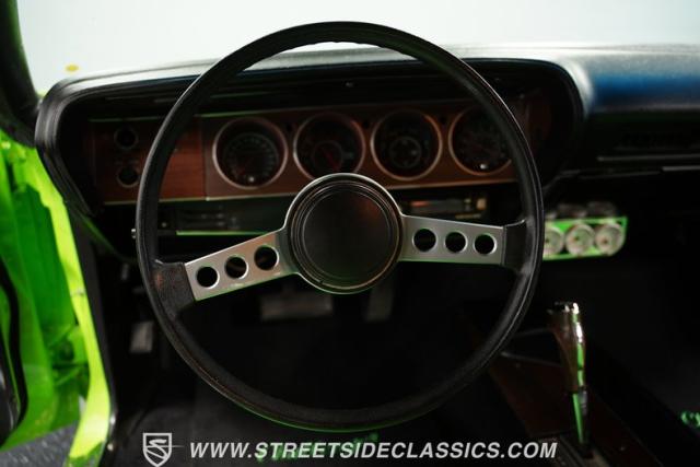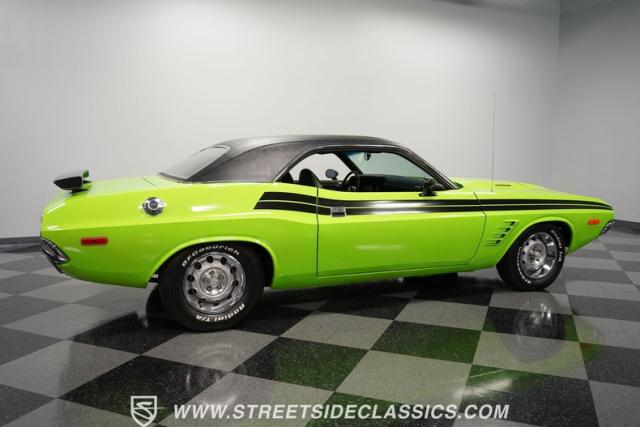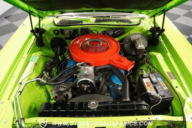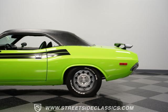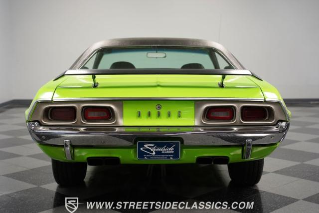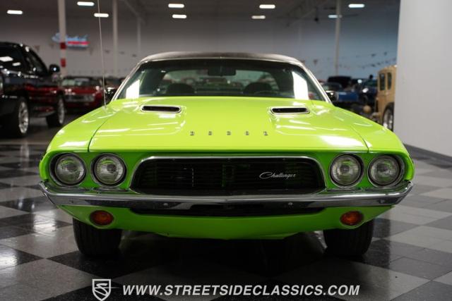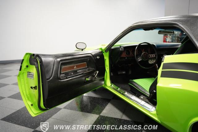 This 1973 Dodge Challenger Rallye roars with personality, showcasing a dazzling Lime Green exterior that captures the spirit of its era. The black vinyl top adds a classic touch, contrasting beautifully with the bold green paint. The Rallye package includes striking black decals that run along the sides, enhancing its aggressive stance. Sitting on 15-inch Mopar Rallye wheels wrapped in 215/70R15 front and 235/70R15 rear BFG Radial T/A tires, this Challenger looks ready to conquer any road. The dual racing mirrors and rear deck spoiler complete the picture, making this a true standout among muscle cars.