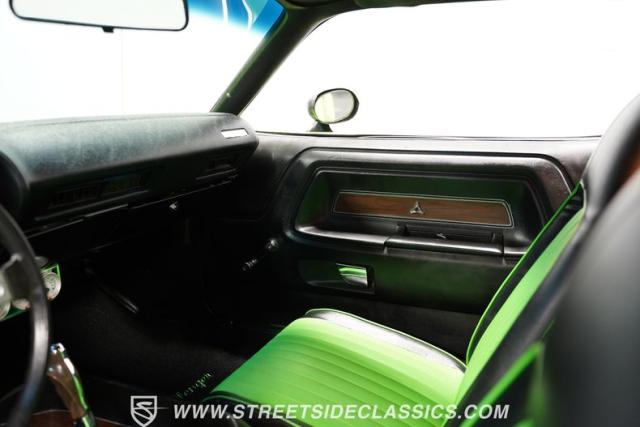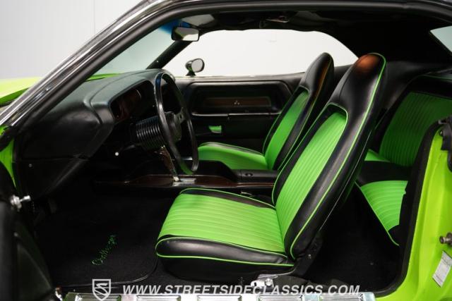 Inside, this Challenger offers a blend of vintage style and modern comfort. The black vinyl bucket seats, accented with bright green inserts, give the cabin a sporty feel. The Rallye gauges and the iconic \"pistol grip\" shifter are a nod to its performance heritage, while the Vintage Air conditioning system ensures a comfortable ride. An aftermarket CD radio and rear speakers provide the soundtrack for your drive, and the custom logo floor mats add a personalized touch to the well-preserved interior.