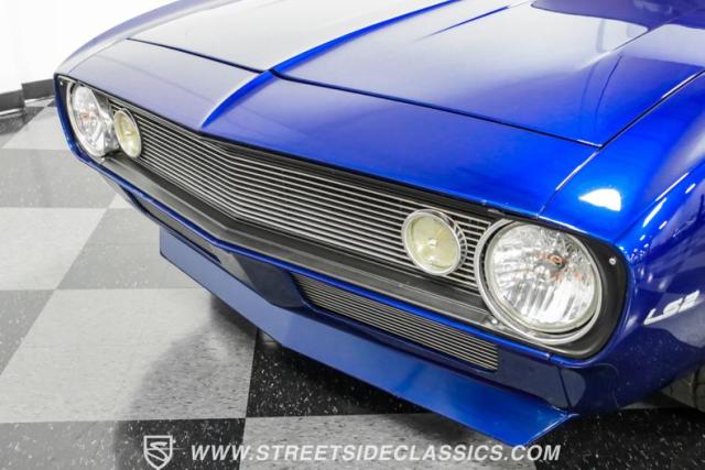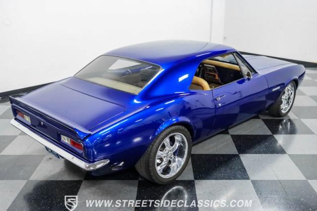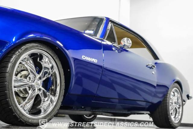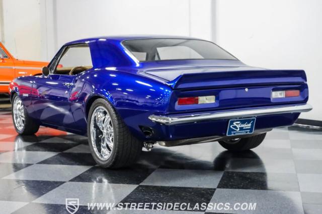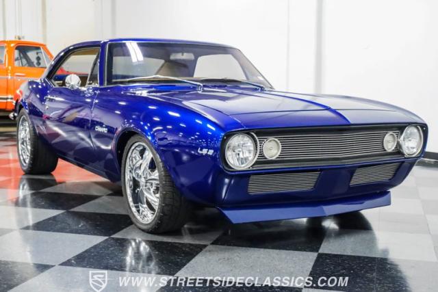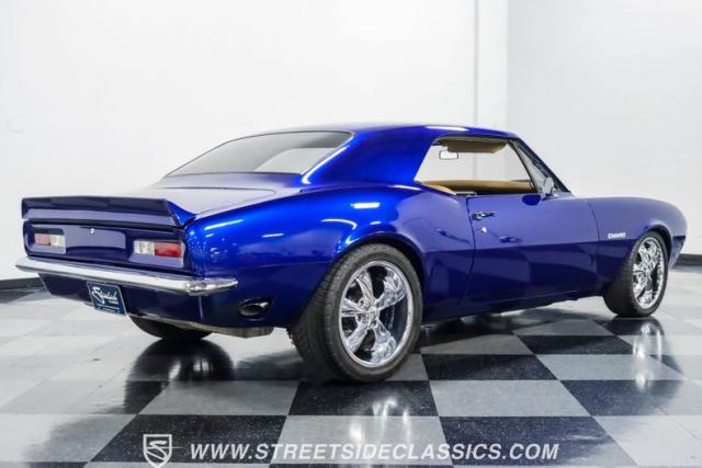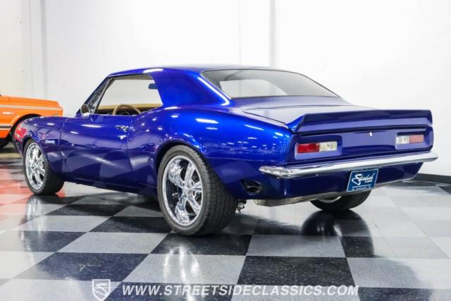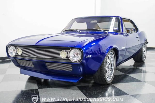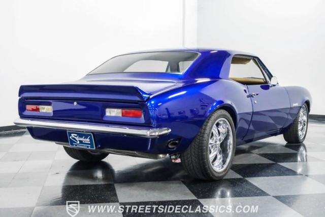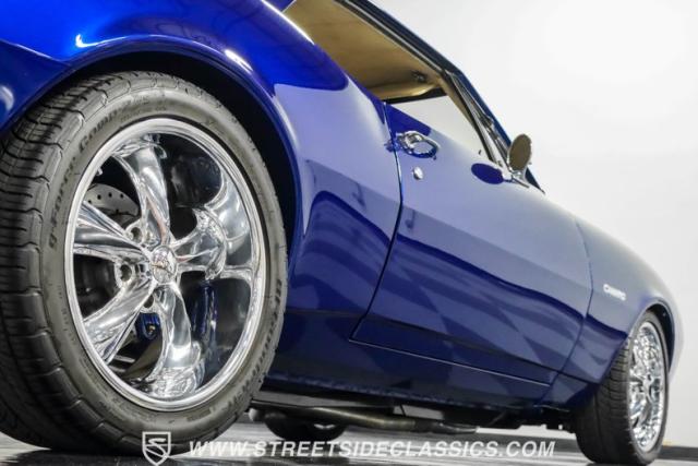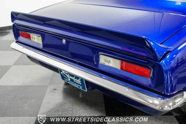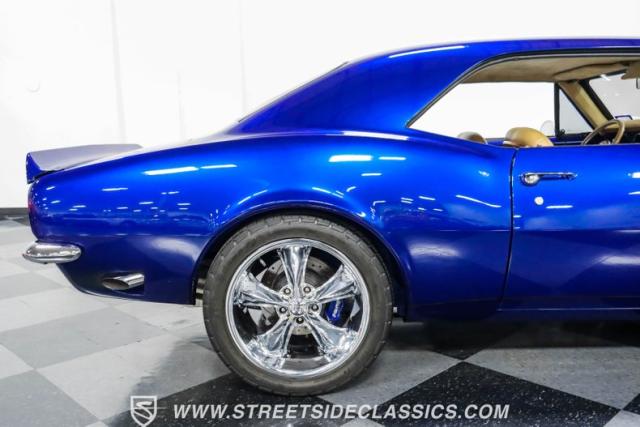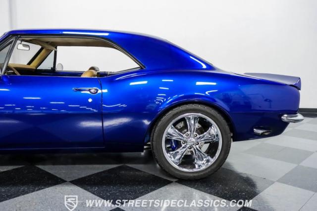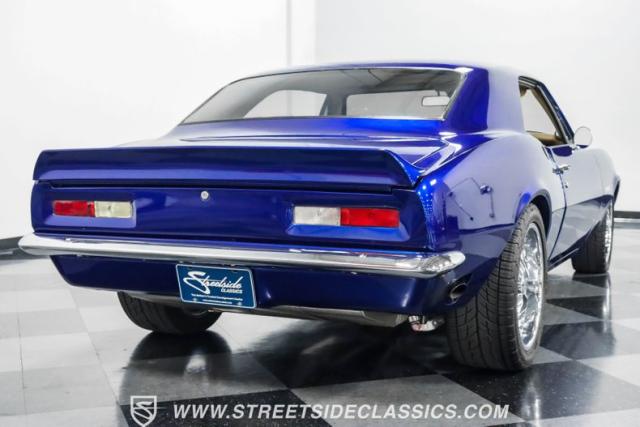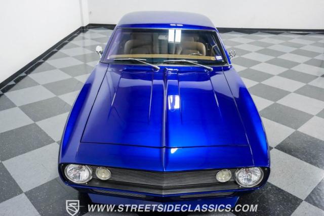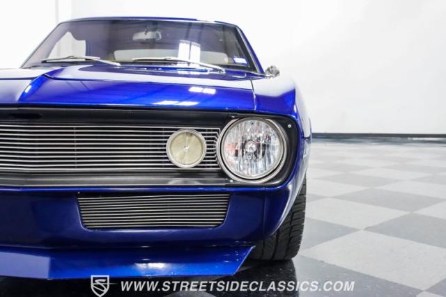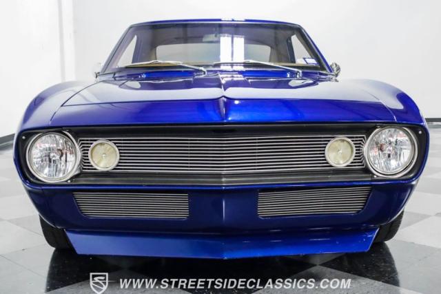 Built in California and recently dialed in by Speed Tek of Fort Worth, this 1967 Chevrolet Camaro Restomod showcases custom bodywork with shaved drip rails and very cool custom exhaust exits through the quarter panels! The sleek Indigo Blue exterior further features a billet grille, custom front clip, and rear spoiler. A set of QA1 coilovers gives it an athletic stance as it rolls on 18-inch Foose wheels wrapped in BFGoodrich rubber - 225/40ZR18 front and 275/40ZR18 in the rear.