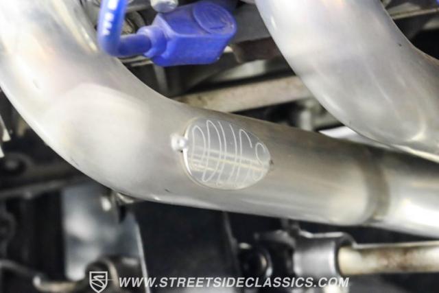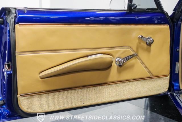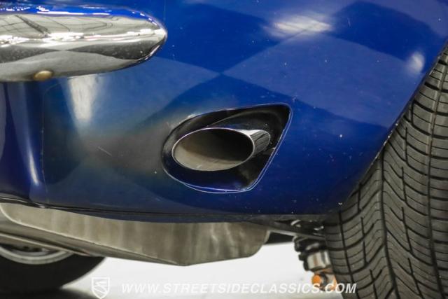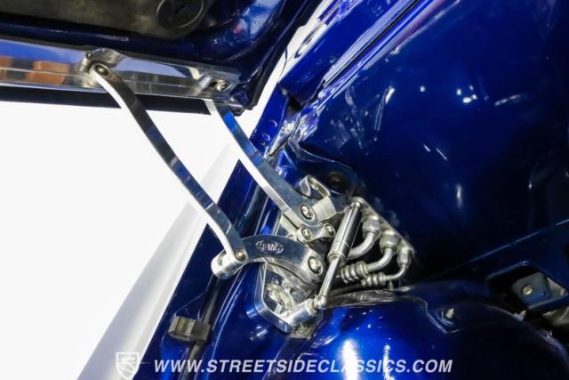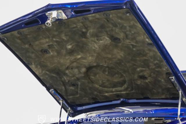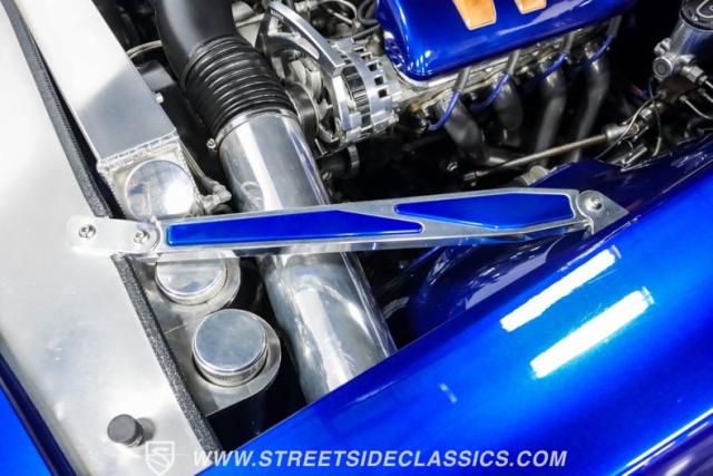 The tan leather interior features custom-crafted front and rear bucket seats, balanced with blue contrast stitching across all seating surfaces. A custom center console runs front to back, incorporating well-placed cup holders and a distinctive shifter setup. Classic Instruments gauges provide vital information through a tilt steering column topped by a Foose-styled wheel. Modern amenities include power steering, Vintage Air conditioning, and a JVC AM/FM/CD/Bluetooth stereo system. The suede headliner adds a refined touch overhead, while tan carpets complete the upscale theme throughout the cabin.