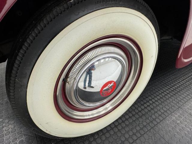 Seen inside is a complimenting camel tan leather bench with piping and buttons, as well as plenty of gleaming chrome. A very Art Deco inspired AM radio sits in the center of the dash and uses the speaker bezel to house bakelite knobs for station preselection to the right and the band selector to the left. Originally sold in New Jersey, as the norm, we see a heater installed under the dash. A clock resides in the maroon steel in front of the passenger and in front of the driver, more bakelite knobs and a rectangular bezel housing the speedometer and its flanking auxiliary gauges. In the front, a black rubber mat is seen, and beautiful brown carpet covers the floors in the rear, and a front matching sprawling overstuffed rear bench seat is in the back of this car. Art Deco styling is pulled off with contrasting cream color paint, and chrome on the dash. A perfectly restored steering wheel is fronting the dash.