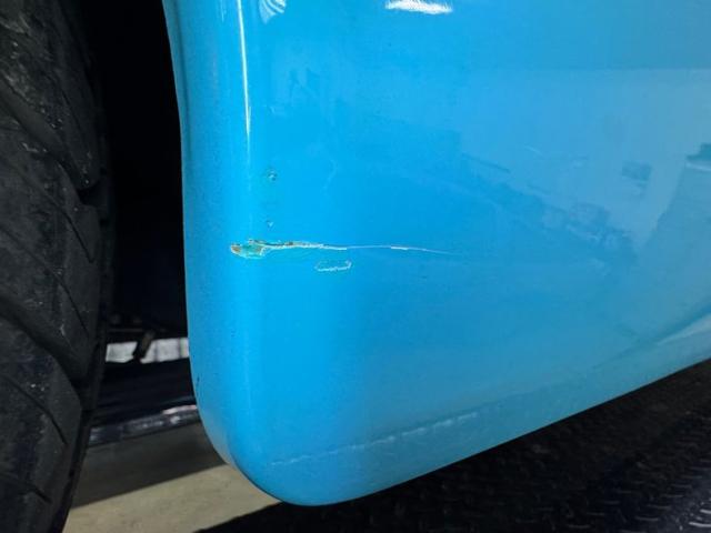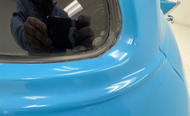 Gray tweed tops gray vinyl on the door panels in clean and tidy presentation and electric window switches are included, but you\'ll still have to crank the vent window old school style. The split bench seat is also handsomely patterned with the gray tweed and in excellent condition, matched in quality by the rear bench. Artistic designers sculpted a beautiful steering wheel with a sporty, boomerang shaped spoke and sweeping horn ring. Blue and polished metals make up the layers and sections of the dashboard where we experience old and new again with modern white faced gauges. An AM/FM radio is mid panel and an old school clock far right. Our open floorplan features an added center console with cupholders while the gray carpet below is perfect and adorned with blue rubber mats. The cargo area wears that same gray carpet and looks practically new and it\'s here we note some tinges of surface rust on the tailgate seam and hinge area.