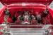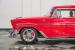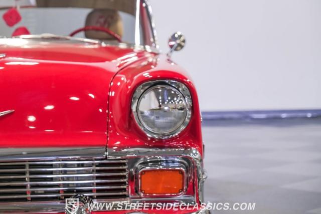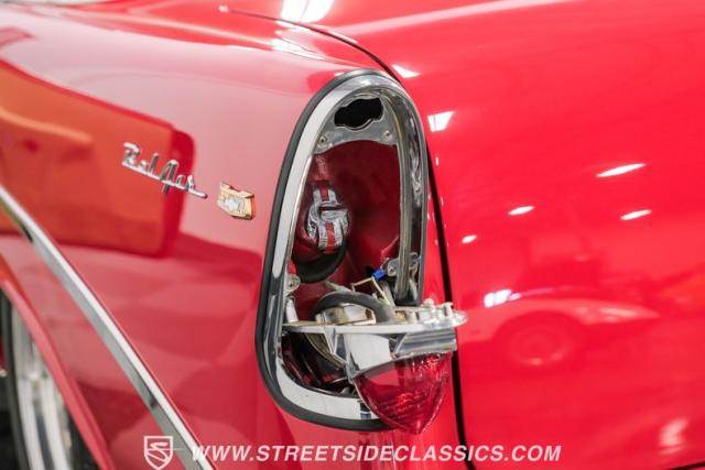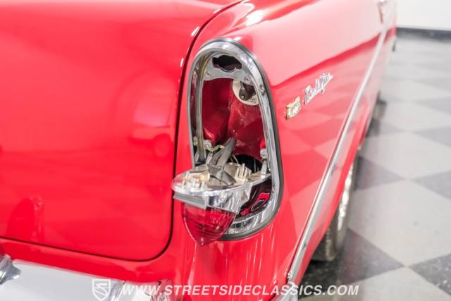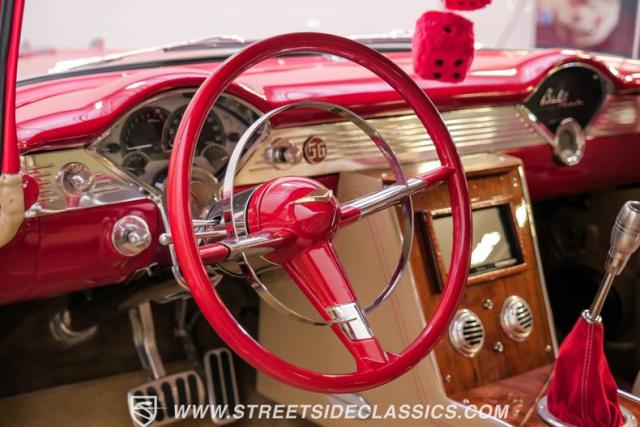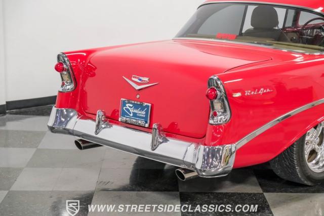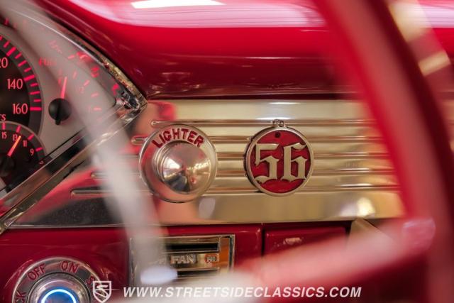 This car strikes a balance between an iconic classic and an all-out modern hot rod. The Fire Engine Red is close to the other colors available from Chevy in \'56, and so it doesn\'t look out of place on this one. But there\'s a deep gloss and shine that instantly announces this is a modern and professional application. In fact, the full build only has about 1880 miles on it. And since brightwork is a big part of this icon, you can see that the full restoration made it a priority. The bumpers are mirror-like, the light bezels are intricate, and 1956\'s exclusive grille is proudly displayed. The \'56 Bel Air had the unique style shared with no other Tri-Five where it rocketed up the side to make the car look sleeker and faster. So not only do we love that this trim looks excellent, but also that they took the time to get the body looking so good that it\'s like one unbroken piece through the door line. This inherent sleekness goes well with the upgraded performance appearance. Those large dual exhaust tips, fuel injection callouts, and 17-inch Billet Specialties wheels help add to the shine while also announcing it\'s something extra special.