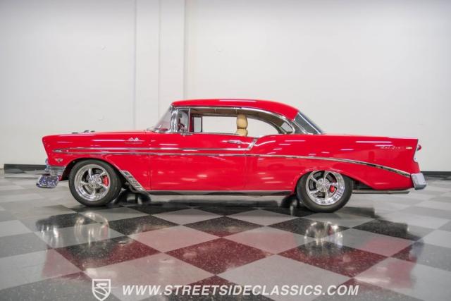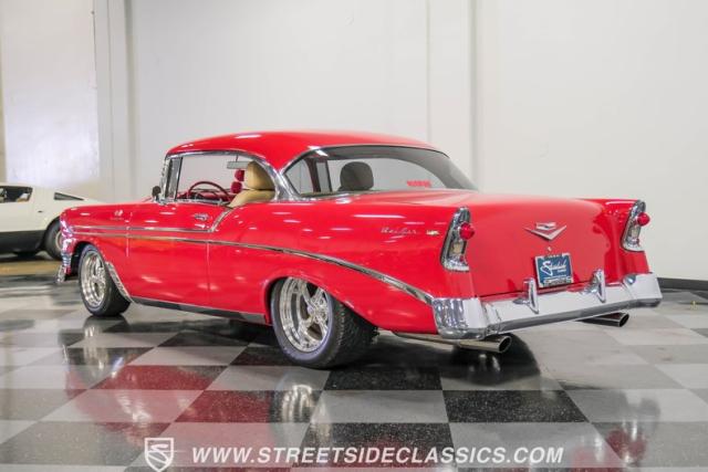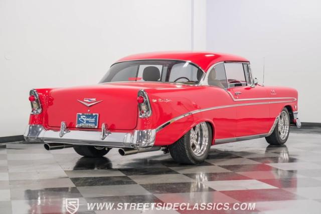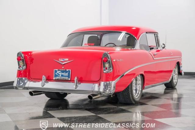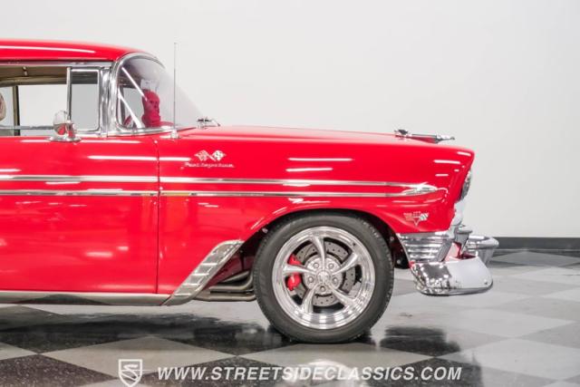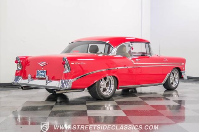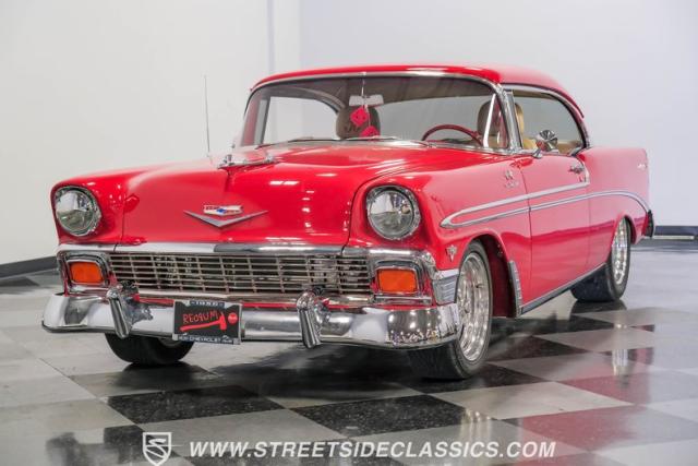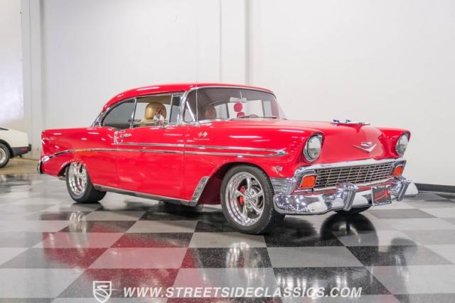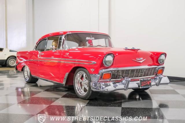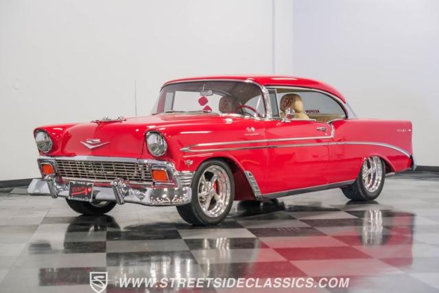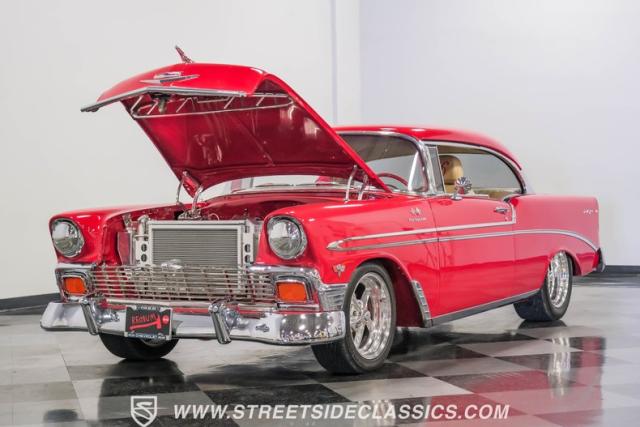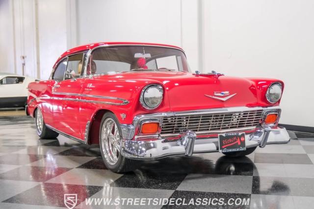 The 1956 Chevrolet Bel Air hardtop restomod is already desire on wheels, but one look at this one, and you can tell it has even more to offer. There\'s amazing paint, glittering chrome, a full custom luxury interior, air conditioning, an overdrive transmission, four-wheel disc brakes, serious fuel-injected V8 power, and much more. It\'s been built for the true enthusiast who loves to drive everywhere and win trophies on arrival.