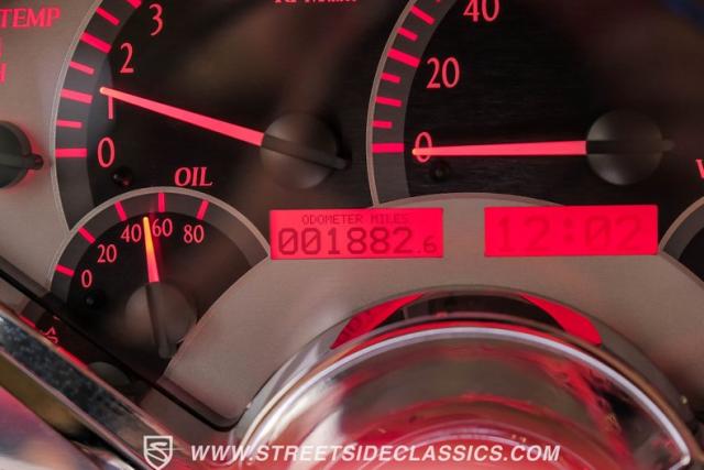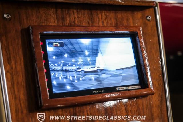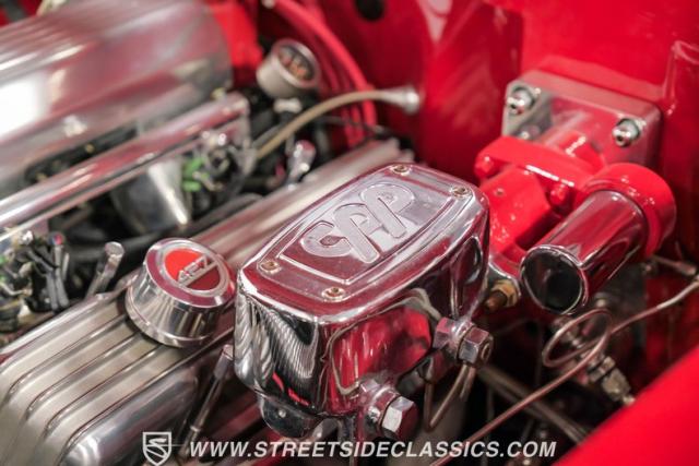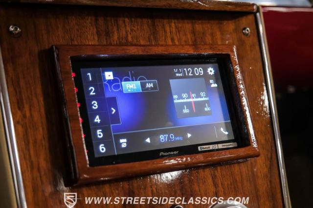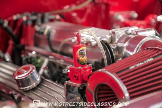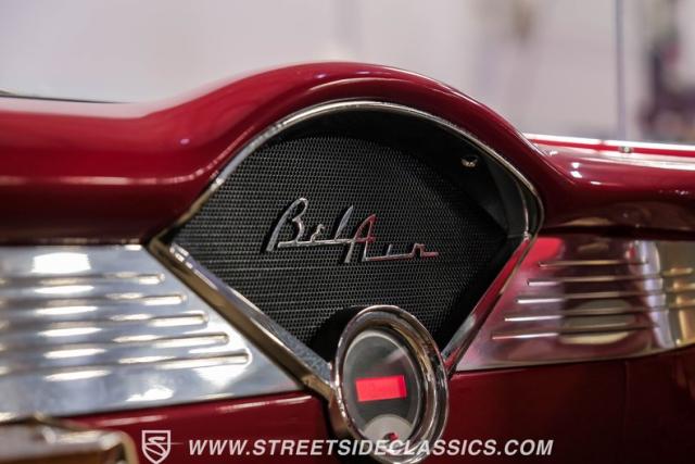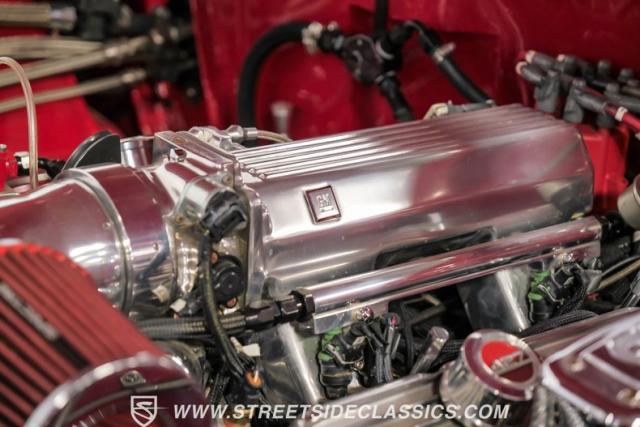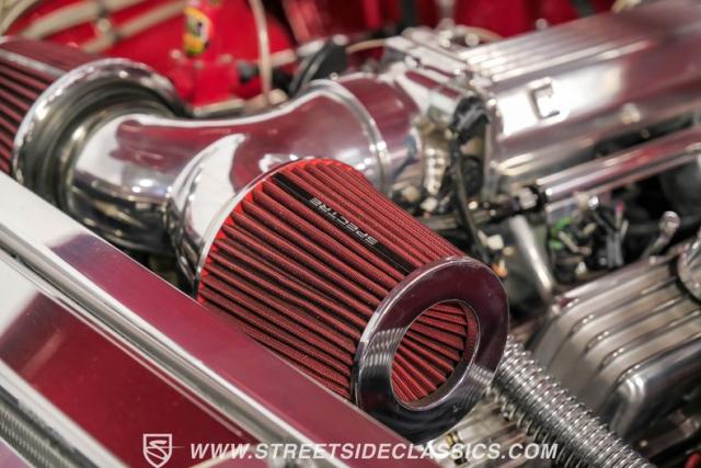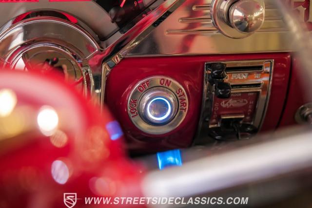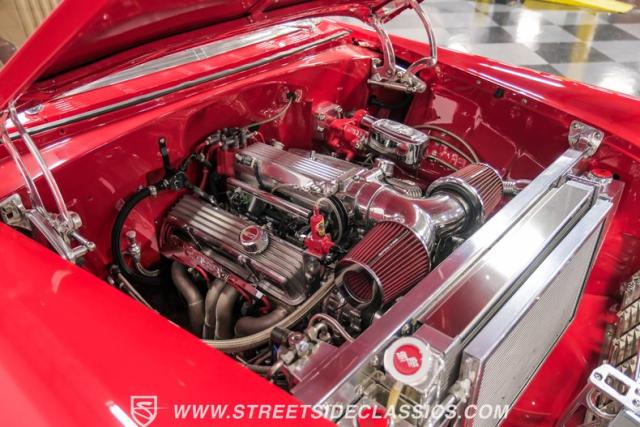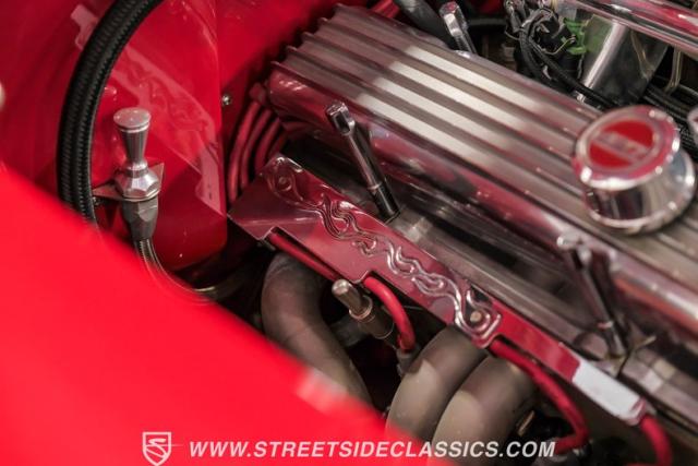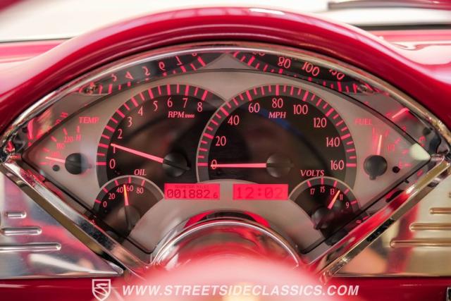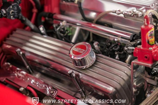 The interior is a full custom setup. In fact, the only thing that\'s likely going to remind you inside that this is a vintage Chevy is the twin cowl dash. Everyone gets their own-individual Ultraleather bucket seat with a custom center console running the full length of the interior. These seats are beautifully finished with nice details like red contrast stitching and the door panels were done to match. It\'s quite clean and complete where even the fully finished trunk looks like the perfect place to display some awards. There are plenty of luxury upgrades like cold-blowing air conditioning, power windows, and a touchscreen AM/FM/XM stereo with Bluetooth. The driver\'s seat is a true command position with a power-adjustable high-back bucket, an updated classic-style steering wheel on a tilt column, and full gauges with speedo and tach.