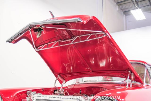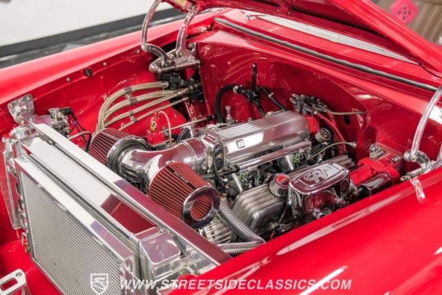 This engine bay has an award-worthy presentation all on its own. You see a huge investment in polished components that are presented beautifully against the smooth color-matched inner walls. The trim tag is not present to confirm that this was born a V8 Bel Air, but as you look at that shining heart, you realize that point is moot. Because while this carries the tradition of the best Tri Fives with a small block, this is now a Dart Little M 427 cubic-inch V8. More than just the small block weight with a big block displacement, this is built with power upgrades like aluminum heads, an aluminum intake, and headers feeding the dual exhaust. And there\'s a fuel injection system on top to deliver the best in power and consistency. Plus, the monster motor has all the right supporting components, like a serpentine belt system, an MSD ignition, the battery mounted in the trunk for better weight distribution, and Be Cool aluminum radiator w/dual electric fans. The big power V8 feeds the stout 4L80E four-speed automatic transmission. It\'s a strong setup with a tubular A-arm front end, a triangulated four-link rear, adjustable coilovers all around, and a reinforced frame. It\'s all great for performance upgrades, but don\'t forget that the transmission has overdrive for the highway. So no matter if it\'s blacktop domination or weekend cruising, you\'ll appreciate features like power steering, modern performance tires, and Wilwood four-wheel disc brakes with drilled & slotted rotors.