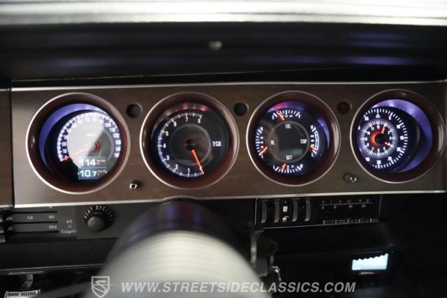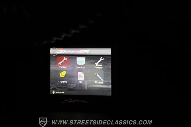 Black vinyl covers the performance-oriented interior of this \'Cuda. The bucket seats offer good support during spirited driving while the center console with iconic pistol-grip shifter allows quick gear selection. All gauges are upgraded and visible at a glance with crisp, clear readouts and the original AM//FM radio is still in place. The all-black color scheme creates a no-nonsense atmosphere that puts the focus on driving. An updated air conditioning compressor keeps the cabin cool on hot days.