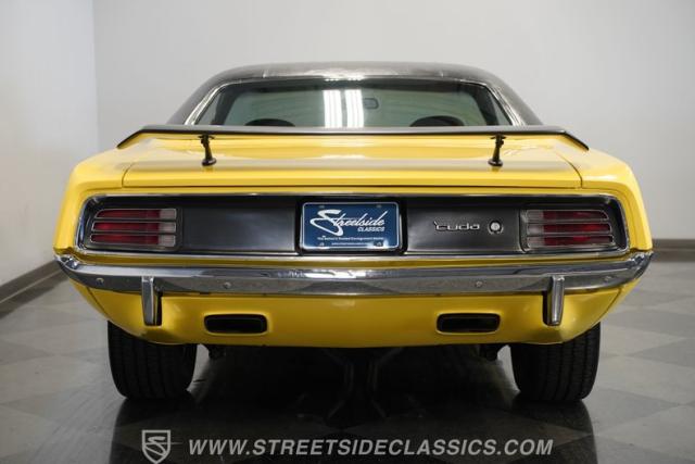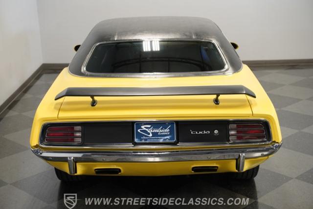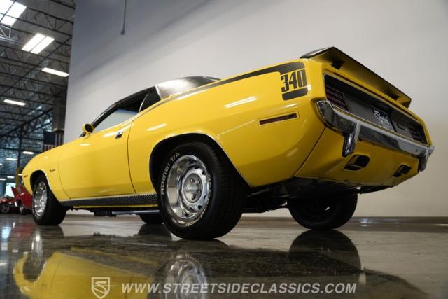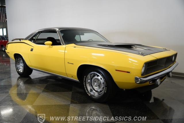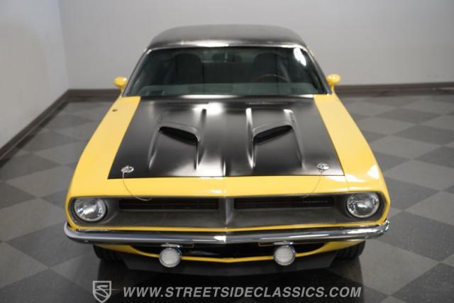 Genuine S-code muscle from Mopar\'s years glory, this 1970 Plymouth \'Cuda stands tall among American performance legends. High-impact Lemon Twist paint blankets the distinctive E-body silhouette, which, along with the black vinyl top and black-painted twin-scoop hood, give this coupe unmistakable presence. The hood scoops add athletic character while the go-wing deck lid spoiler punctuates the rear. Classic 15-inch Mopar original-style wheels provide the perfect foundation. The wheels are wrapped in BF Goodrich Radial T/A rubber - 235/65R15 up front and meatier 255/60R15 in back, completing the aggressive stance that made these machines famous.
