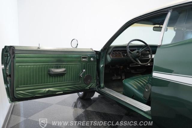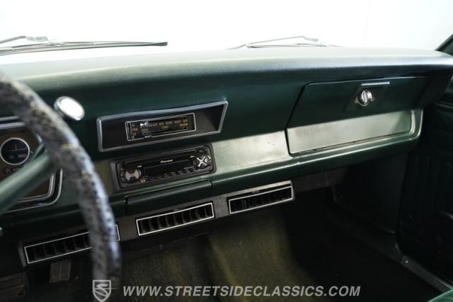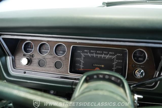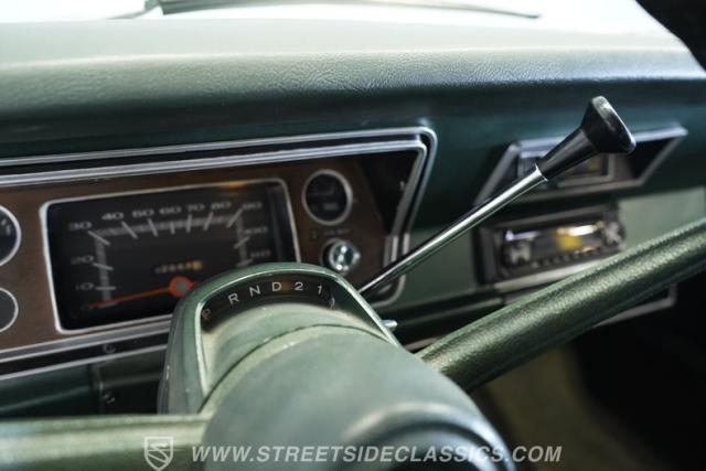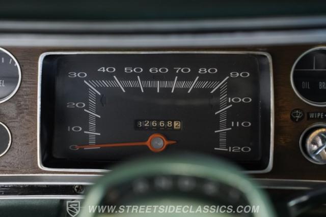 Inside, you\'ll find a welcoming, factory-inspired green vinyl interior with a recovered split bench seat that offers both comfort and classic charm. The matching green door panels and woodgrain cluster surround create a cohesive, vintage atmosphere. Modern touches include an aftermarket Pioneer stereo and upgraded door speakers, blending period-correct style with contemporary convenience. The carpet is in good shape, and the dashboard shows well, making the cabin a pleasant place for both daily drives and car shows.