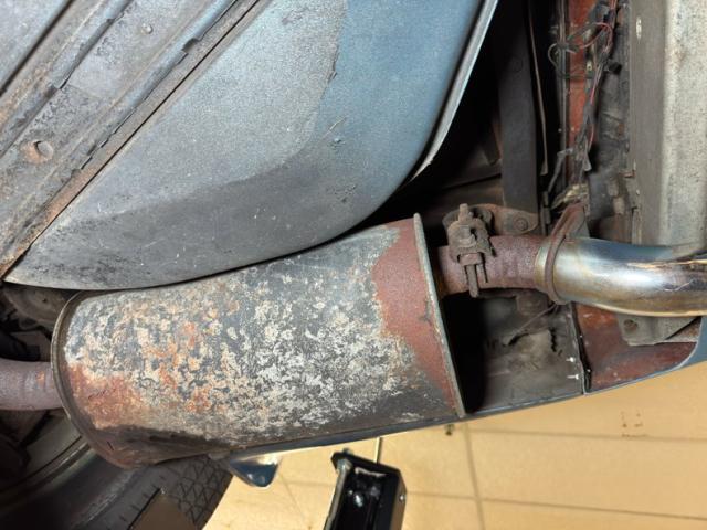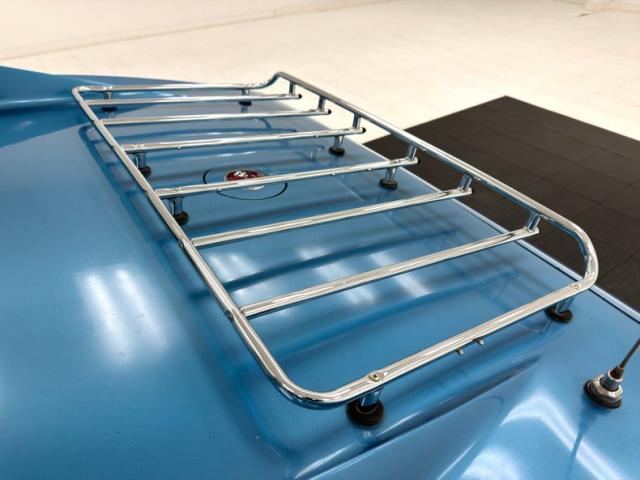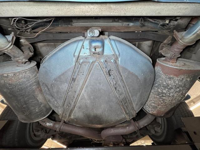 A surface rust only underside that has good structural stability with a light patina on the flooring and frame. The factory style dual to single to dual muffler exhaust arrangement is on to handle the mighty exhale and we note power disk braking is all around. Independent coil spring suspension up front and a fully independent rear suspension with a frame anchored differential and transverse leaf spring provides the ride and rail like handling.
