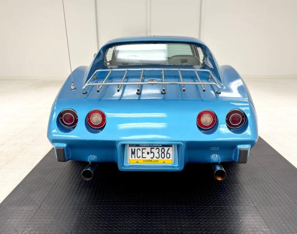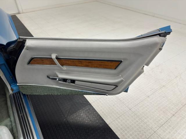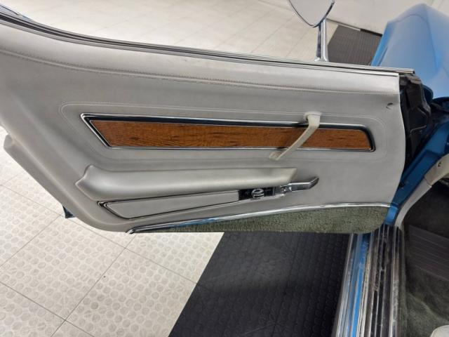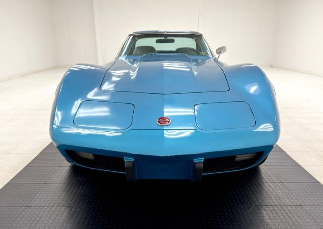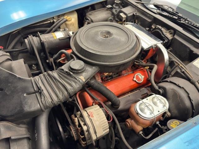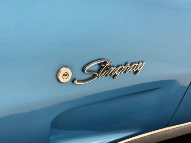 Deep end of the pool, very nice Bright Blue Metallic coats pristine fiberglass and neoprene on this garage kept curvaceous example. A few areas of \"road rash\" are noted on the lowers of the body along with some notable chips on the pointed neoprene nose. The iconic Stingray \"gills\" vent cool air into and out of the engine bay from directly behind the front wheel wells. Brightwork is in good condition and shows up on the door handles, front glass frame, side view mirrors and rockers. The long hood leads the way and it sports hidden headlights in front as well as a rear vented scoop while the roof panels are removable and are in body matching blue. You gotta love the flying buttress B pillars framing the near vertical rear glass and we also note the rounded rear look with the circular tail lights are iconic in their design. 15-inch polished and slotted wheels are wrapped by older blackwall 215/75R15\'s all around.