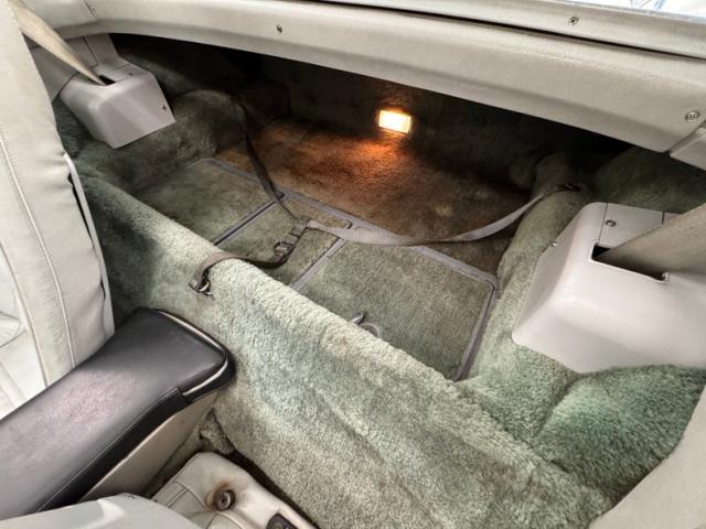 Some smoke gray vinyl and wood appliqu, along with minimal chrome trimmings cover the door panels. Sleek thin styled high backed leather buckets show some slight folds, as leather tends to do with age, but there is also some seam separation noted on the driver\'s bucket at the bolster piping. The center console has a nicely padded black leather armrest and this drives the eye forward to the shift lever lighter and temp wheels. The deep set gauges in the swooping upward and outward dash are original, and appear as very clean. Next to this driver\'s panel is a group of 5 instruments to help keep the pulse, and just below the center dash of this car is the factory AM/FM radio. Behind the seats is the rear storage area covered in soiled gray carpeting, as are all the floors where the seats are and under the dash. I have to comment on all the chromed surrounds, lettering on dials and levers and all over, I see none of it is chipped off. This is a rare detail not often experienced on these cars of this year, so it WAS well taken care of.