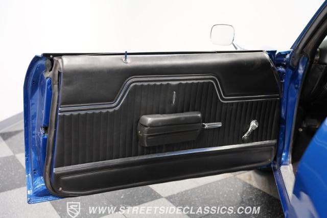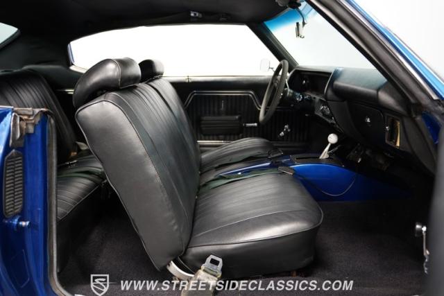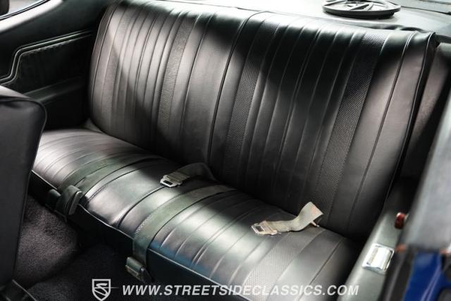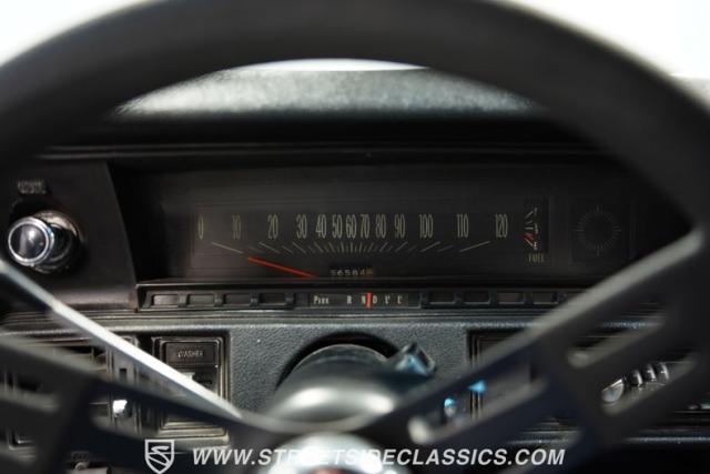 The black vinyl interior creates a purposeful cockpit environment. A custom center console houses a Hurst shifter, while the bench seat provides comfortable cruising. The dash features SunPro oil, temperature gauges, and a dual-head unit stereo system with rear deck speakers. Power steering gives you complete control, while auxiliary USB connectivity adds modern audio options. The black carpets and headliner complete the cohesive dark theme.